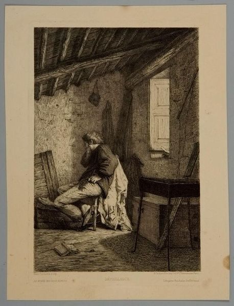 Editor: This is "Fainting" by Saro Cucinotta, made sometime in the 19th century. It's a small print, and the figure looks so defeated. What do you see in this piece? Curator: The image powerfully depicts not just a physical collapse, but perhaps the societal pressures faced by women in Cucinotta's time. The 'fainting couch' was a very real object for a very real phenomenon. Editor: So, it's about more than just a physical ailment? Curator: Precisely. Consider the constricted interior space. Does it reflect the limited roles available to women? The open book suggests intellect, perhaps stifled. This is a discourse on confinement and the fight for autonomy. Editor: I hadn’t thought of it that way. It definitely adds a new layer of understanding. Curator: Art invites us to connect the personal with the political.
