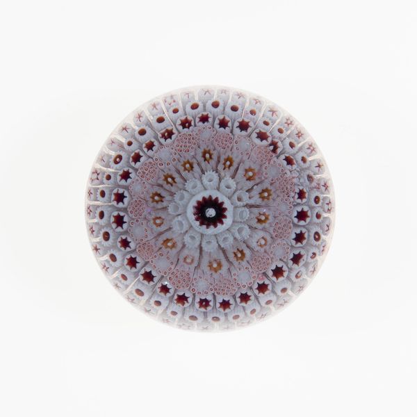 Editor: Here we have a glass vase, dating from around 1845 to 1860, created by the Compagnie de Saint Louis. Its radiant red hue and crisp, geometric cut give it a real sense of vibrancy. How would you interpret this piece, focusing on its visual aspects? Curator: Immediately striking is the object’s insistent circularity. The vase itself presents concentric rings of red glass, a form mirrored, yet softened, in the floral design of the underlying paper support. Observe the tension between the rigidity of the glasswork and the almost pixelated effect of the painted flowers. How does that relationship strike you? Editor: That’s fascinating, I hadn't considered that interplay. The red glass definitely commands attention. It's almost like a lens, distorting and intensifying the floral pattern beneath. Does this distortion play a part in your analysis? Curator: Indeed. The refraction afforded by the glass adds another layer to our visual decoding. The paper beneath, itself a structured, manufactured material designed for application, is here revealed to possess painterly, even organic qualities when viewed through the prism of carefully wrought glass. Note how one manufactured artifact lends perceived properties to the other through simple proximity and optical effect. Editor: So the artist exploits the properties of glass not just for its colour or form, but for its ability to reshape our perception? Curator: Precisely. Colour is, of course, a key factor here too. Consider the semiotics of colour at play; the colour itself acts as a symbol, an enhancement. We have considered it an enhancer to our vision and how we see through it to view the art beneath. Do you appreciate more clearly the structure and visual elements now? Editor: I definitely do. Focusing on the interplay of materials and the manipulation of perception has given me a new way to look at decorative arts. Curator: Excellent. It is in this nuanced understanding of structure and materiality that the deeper significance of an artwork often lies.