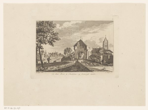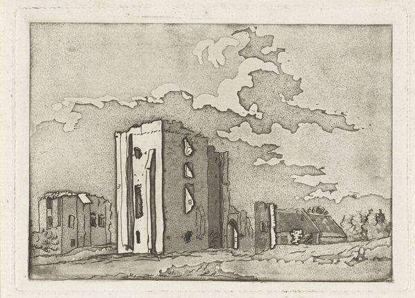 Editor: This is *Dorpsgezicht met toren en kerk* by Jacob van der Heyden, a print made sometime between 1583 and 1645. It's a lovely engraving, a simple village scene. The crumbling tower feels very stoic, but I wonder what this image really signifies. What do you see in this piece? Curator: I see a powerful visual statement about the societal shifts during the Dutch Golden Age. The prominent tower and church, rendered with such detail, speak to the established order. But notice how they are also depicted with signs of decay and ruin. Editor: So, the decaying architecture is symbolic? Curator: Exactly. It can be interpreted as a critique of the religious and political institutions that dominated society prior to the rise of the Dutch Republic. The landscape, though pastoral, highlights a transition. What's replacing that fading structure? Editor: Perhaps… a new social order, driven by commerce and individual freedoms, emerging from those ruins. Curator: Precisely. Consider also how prints, as a medium, democratized art, making it accessible beyond the elite circles who had historically controlled visual narratives. It reflects who controls not just images, but interpretations of cultural and political power. Editor: That makes the artwork's symbolism and messaging feel more pertinent, by tying the printmaking process into the social movements it represents. It is quite intriguing to analyze beyond its aesthetics. Curator: And hopefully provides a framework to investigate and advocate for change within systems today. Editor: Definitely food for thought. Thanks for broadening my perspective.