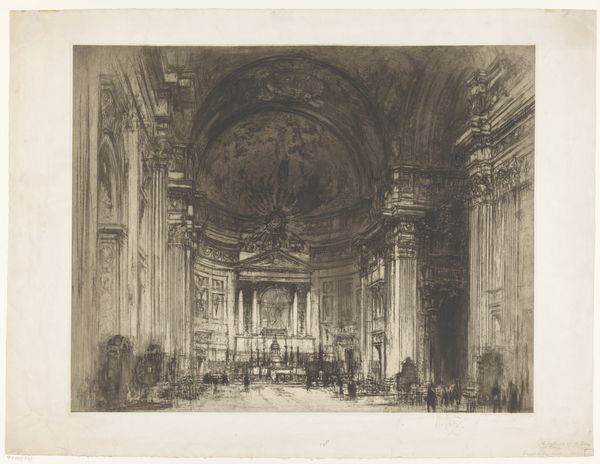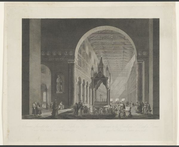 Curator: This engraving by Adrien Dauzats, created between 1837 and 1845, offers us a view of Bernini's baldachin within St. Peter's Basilica in Rome. Editor: The scale is just breathtaking. Even in this monochrome print, I can feel the immense space, and the weight of the architecture. The baldachin dominates, doesn’t it? Curator: Absolutely. What I find compelling is the way Dauzats situates this icon of the Catholic Church within the social and political context of 19th-century Europe, during the resurgence of Neoclassicism. Editor: The labor that went into constructing this, both Bernini's baldachin, and Dauzat's rendering. Imagine the copperplate engraving itself, replicating that ornamentation. The material translation is stunning. Curator: The engraving almost elevates the architecture to a symbol of power and perhaps even, hegemony, considering its place within the Vatican. This period also saw many people questioning faith, its very material foundations as such were put into scrutiny. Editor: Exactly. Think about where the materials to build it come from, and where Dauzats sources the materials needed for the engraving; the physical act of creating art or architecture has consequences in and outside artistic creation. It prompts a discussion on value, consumption, and labor within the church and society itself. Curator: And how architecture impacts social movements by fostering community gatherings but is in its intrinsic nature exclusionary to marginalized people and belief. It opens discussions about accessibility and equal spaces. Editor: Thinking about its context and composition helps re-center that relationship. Bernini created his altar for the pope in the 1600s while the Church struggles and survives plague, conflict and constant reinvention. Curator: Seeing how art and power intersect like this continues to teach us a lot, doesn’t it? It enables us to look at institutions with a wider scope while studying the very definition of art. Editor: It does make you appreciate the physical act of creation. The labor of Dauzats bringing us this immense vision, it prompts a respect for what is tangible and how deeply materials shape and reflect broader narratives.
