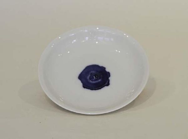 Editor: Here we have Arlene Shechet's "Cock Plate (Head on a Plate 8)." It's a small ceramic piece, and I find the title really clashes with the delicate, almost melancholic feel of the work. What do you make of the piece? Curator: The title is intentionally provocative. Shechet’s work often critiques the traditional presentation of ceramics, particularly within museum contexts. Consider how the "domestic" plate subverts traditional sculpture. Does the title also challenge conventional notions of beauty? Editor: That's a great point. It makes me think about how art institutions themselves shape our expectations and understanding of art. I hadn't considered the plate as a domestic object. Curator: Exactly. And the "mistake" of the green pigment creates another kind of beauty, or lack of it. What can happen when we move beyond functionality in art, and accept disruption in the art world? Editor: I guess I was too caught up in the shock of the title to appreciate the layered commentary. Now I am thinking a lot more about the traditional role of ceramics. Curator: Yes. It is all about the institutions and how they can shape art.