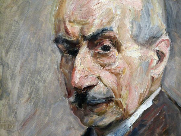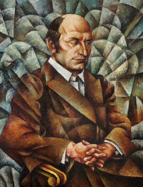 Editor: Here we have Kuzma Petrov-Vodkin’s "Self-Portrait" from 1927, rendered in oil paint. I find its subdued color palette quite arresting. What’s your interpretation of this painting? Curator: Arresting is a good word for it. What strikes me most is the disquieting gaze and almost unsettling confidence with which the artist meets your eye. The cool blues in the background and the shadowy child suggest an introspective, perhaps even melancholic mood despite that gaze. He seems to be challenging you, doesn't he? Are you sure you want to look? Editor: Absolutely! I hadn't noticed the figure in the background at first. Is that common in his self-portraits? Curator: It's an intriguing addition, isn't it? Petrov-Vodkin often used symbolism and complex compositional techniques. The child's ghostly presence here could signify his hopes for the future or perhaps a more profound reflection on mortality. Given this work was created in the Soviet era, what do you think it reveals about Petrov-Vodkin's positioning between avant-garde artistic expression and the emerging aesthetic requirements of the time? Editor: That's a great point. It feels very different from Socialist Realism but maybe with a hint of… reserved hope? The somber tones do convey complexity beyond simple propaganda. Curator: Precisely. He captures the zeitgeist without wholly subscribing to it. It’s a clever negotiation, perhaps born of necessity. Looking closely at the planes of his face, what details leap out at you about his use of colour to portray emotion? Editor: I can now sense the weight of the artist's personal experiences seeping through the surface. His world wasn't black and white, and his representation reflects that nuanced complexity. Curator: Exactly! Art reflects reality. This painting shows the emotional strain and stoic determination of a man existing between worlds.