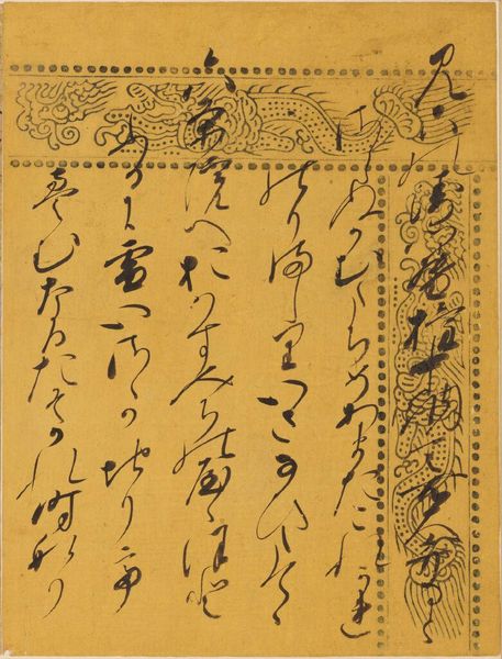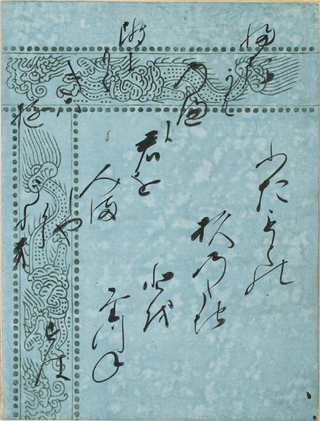Curator: We’re looking at “Bracken Shoots,” a fragment of calligraphy by JÅhÅji KÅjo, excerpted from the 48th chapter of The Tale of Genji. Editor: I'm struck by its serene quality; the pale green background feels unexpectedly calming. It is a small piece, no? Curator: Indeed, it is of intimate scale. Note the dynamism of the brushstrokes, the contrast between the dense calligraphic marks and the negative space. Editor: The dragons bordering the text add a protective layer, don't they? They evoke power, tradition. This excerpt must carry a weight of meaning beyond its literal text. Curator: Precisely. Calligraphy here transcends mere writing; it becomes a symbolic expression of narrative and cultural memory, imbued with the emotive resonance of Genji. Editor: The characters almost dance; they possess a life of their own, liberated from strict legibility. Curator: A compelling interpretation, revealing how form itself conveys significance. Editor: It is a world contained within a single page. Curator: I find myself pondering the dialogue between textual fragment and the larger narrative tapestry.