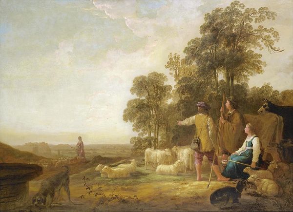 Editor: So, here we have "A Bit of Southern England" by John William North. It's rather small, painted on a piece of board. It feels very pastoral, very calm. What strikes you most about this work? Curator: It’s a memory, perhaps. Not just of the landscape, but of a feeling—of the quiet dignity of rural life. Notice how the figures are integrated into the scene, almost indistinguishable from the earth itself. They are one with it. Editor: So, it's not just a landscape, but more of a…meditation? Curator: Exactly! A meditation on belonging, on the slow, quiet rhythm of the land. And, perhaps, a little longing for a simpler time. Editor: I see it now; that's really beautiful. Thanks for opening my eyes to this! Curator: My pleasure, that's the beauty of art; it always gives back.