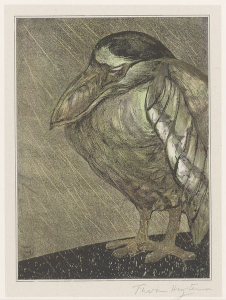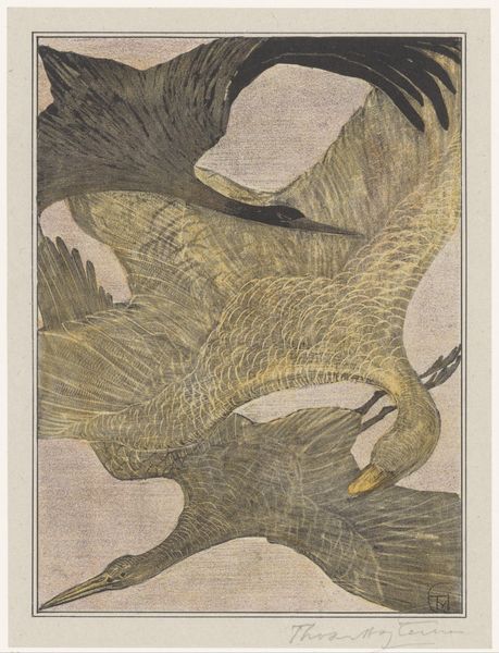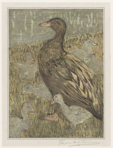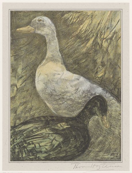 This print of two sleeping ducks was made by Theo van Hoytema. The subdued palette, dominated by shades of grey and brown, evokes a sense of stillness and quietude. The composition is structured by the curves of the ducks’ bodies, creating a dense, almost abstract arrangement. Hoytema’s rendering of texture is particularly striking. Notice the subtle variations in the birds’ plumage, achieved through delicate lines and shading. These details invite closer inspection and engage with the viewer’s sense of touch. The print may be interpreted through the lens of semiotics, where the ducks function as signs embodying tranquility. The composition destabilizes traditional notions of representation, inviting the viewer to contemplate the symbolic potential of everyday objects and challenging fixed meanings. The work prompts us to reconsider our relationship with nature and the ways in which we assign meaning to the world around us.