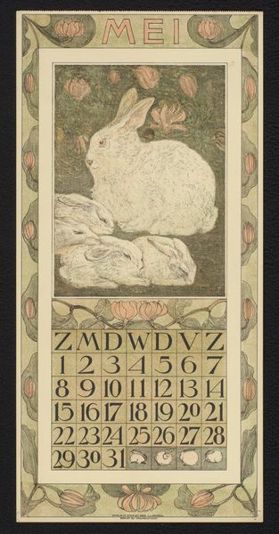 Curator: This is Theo van Hoytema’s "Kalenderblad voor maart 1910 met een paar duiven in een raamkozijn," or Calendar Page for March 1910 with a Pair of Pigeons in a Window Frame, created in 1909. It’s a lovely drawing rendered in ink on paper. Editor: It evokes a sense of quiet domesticity. The soft greys and browns, the tender pigeons—there’s an intimacy to the scene. It feels like a glimpse into a very private, comforting space. Curator: Indeed. Van Hoytema was deeply engaged in the visual language of his time, especially Art Nouveau, and that informs everything here, from the stylized willow branches framing the calendar to the almost geometric rendering of the brickwork. His calendar designs are actually deeply symbolic, even subversive. Editor: Subversive? How so? To me, doves generally evoke peace, home, and serenity; this little tableau seems like a haven, a sort of...yearning for simplicity in an era of industrialization? The calendar grid only reinforces a very organized, practical approach. Curator: Precisely! By integrating themes of nature and domesticity into such a functional object, he was subtly challenging the dominant values of industrial society. In this period there were reformist social movements emerging, where visual language in art began speaking about societal inequity by addressing it with visual respite in times of increasingly toxic urbanization. And notice how he uses the symbol of the dove– it becomes more than just a bird. Editor: The pigeons certainly act as symbols here, clustered at the window—like a married pair seeking a refuge and safety within constraints, like that window! Perhaps a call for peace in a fragmented world. I suppose March, with its promise of spring, is fitting. Curator: Right. These calendars often engaged with very timely sociopolitical themes by encoding these elements within nature-driven images and symbolism. Think of Art Nouveau as visual cultural commentary wrapped in flowers and birds. The design isn’t just decorative; it’s a commentary. Editor: The way he weaves together functionality and this almost pastoral, symbolic imagery gives the calendar a lasting emotional and historical impact, a feeling that perhaps society could heal if only it would return to valuing some sense of simplicity and care. Curator: I agree completely. Hoytema asks viewers to actively engage with how their current society is functioning through themes, which, in turn, subtly critiques its flaws and provides inspiration for a new trajectory. Editor: It is quite fascinating when taking into account that the medium here, ostensibly, is just ink and paper! The complexity is woven between intention, symbolism, and implementation in the final form of an “innocent” calendar.
