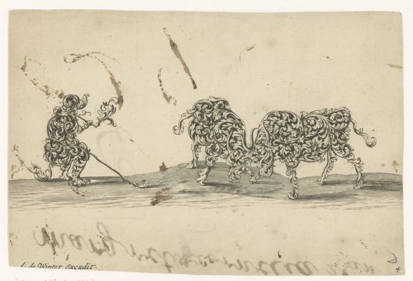 Editor: So, this is Anthonie de Winter's "Ram achtervolgd door hond," from 1698. It's a drawing, or engraving, of a ram being chased by a dog, but both animals are composed entirely of foliage. What strikes me is this curious blending of the natural and the artificial. How do you interpret this work? Curator: It's fascinating, isn't it? This merging of the organic and the constructed speaks volumes about the period. Notice how the animals, symbols of vitality and instinct, are literally built from ornamental foliage. What might that tell us about the artist’s, or perhaps even society's, relationship with nature itself? Editor: Well, it's as if nature is something to be controlled, shaped, and almost worn like a decoration. Curator: Precisely. In the Baroque period, there was a growing fascination with control, order and the display of wealth and status. Using flora as the literal building block echoes classical illusions of paradise, but with this artificial, somewhat restricted composition. Doesn't it seem allegorical? Editor: Yes, perhaps. Are the animals chosen for a specific reason beyond just a chase scene? Curator: The ram, with its curved horns, often symbolizes virility and assertive drive. But the image also might represent the vulnerabilities of pastoral life, of idyllic bliss being interrupted. And dogs in art are frequently linked to obedience, but chasing could signal danger or the hunt as status symbol. So it really speaks to the contrast between cultivated control and inherent instincts. Editor: I hadn't considered the specific symbolism of the animals themselves. I see much more nuance to the image than first impressions offered. Thanks! Curator: Absolutely. That dialogue between symbol and form invites so many compelling interpretations, even today.