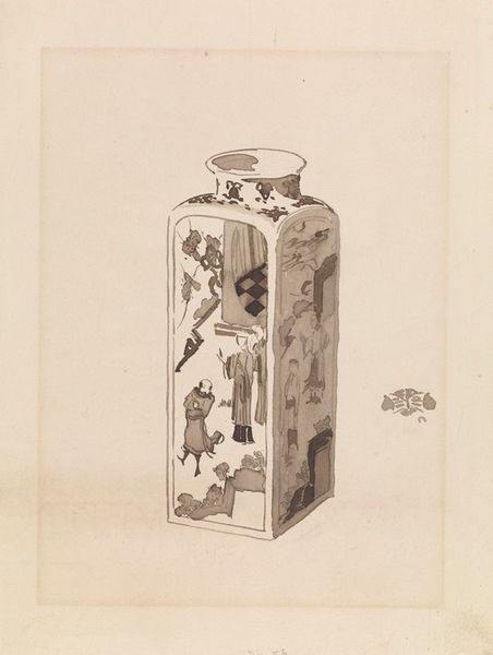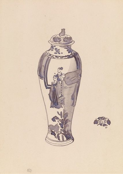 Curator: This delicate watercolor and ink drawing, entitled "Oviform Ginger Jar with Bell-shaped cover," was created by James Abbott McNeill Whistler in 1878. It's quite a charming example of his engagement with Japonisme, wouldn't you agree? Editor: Immediately I’m struck by its tranquility. The soft grays and whites create an almost ethereal feeling. There's such a subtle contrast between the dark, saturated jar and the delicate floral patterns. Curator: Indeed. Whistler masterfully balances positive and negative space. The blossoming branches wrapping around the jar display a confident line and economical brushstroke, a testament to the influence of Japanese art and aesthetics. Editor: That Japonisme influence is impossible to ignore. Consider the time in which this was created! Western cultures were actively exploiting Eastern markets and appropriating aesthetics; it's crucial to look at Whistler's interest not as simple admiration, but also in light of global power dynamics. What kind of consumerism did this piece support? Curator: Your point is noted; the political context can never be ignored. That said, I would highlight the flattened perspective—a key feature of Japonisme—and how it encourages us to engage with the drawing's surface, creating an aesthetically driven experience. Whistler draws our eye in by giving just the right detail in this piece. Editor: Certainly. There's a visual tension too, with that smaller, fragmented motif just floating to the right of the main ginger jar. It almost hints at impermanence, reflecting a core tenant in some strains of Eastern philosophy, maybe acting as a nod to the mortality inherent in our material existence. Curator: Interesting interpretation. For me, this extra motif allows us to consider it as more than a straightforward still life of the period. It moves the composition into new, almost radical, artistic territory for Western audiences. Editor: Absolutely. So, what may appear at first as an unassuming study actually has great visual intrigue that reflects social currents. Curator: Indeed! And from a purely formal perspective, the balance and interplay of light and shadow showcase Whistler's mastery of the watercolor medium. Editor: Precisely! So much to think about in what may appear as just an exercise in simple form.