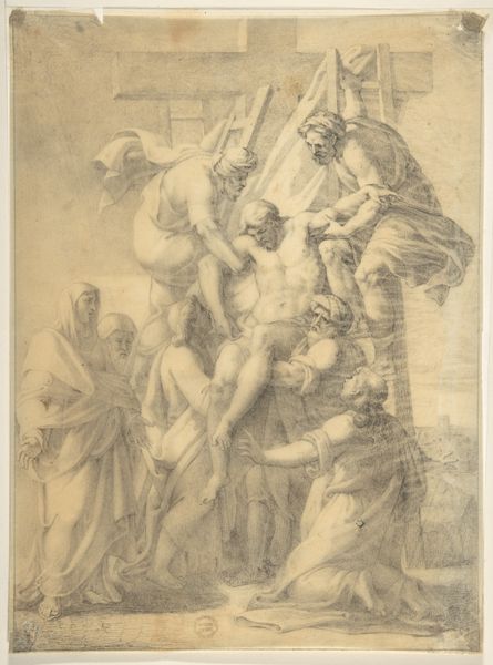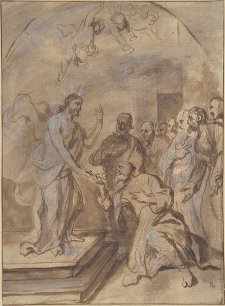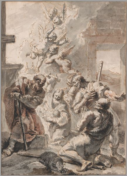 Curator: We’re looking at "Scene at a Fair: A Peep Show," an 18th-century drawing now held at the Metropolitan Museum of Art. It's unsigned. Editor: The sepia wash gives it such a transient feel—fleeting, like a moment caught and already fading. The architecture is only lightly sketched. Curator: Precisely. The architecture merely frames the action. Notice how the figures dominate, particularly the showman presenting his peep show. The composition guides us towards that central transaction. It seems to me, this drawing invites questions about who constitutes an audience and how gazes are constructed. Editor: True, but the artist really emphasizes the fair as a space of exchange—not just money, but labor and human interaction. Look at the materiality, how simple washes on paper convey this bustling scene, this micro-economy. I am really taken by how the scene suggests the materiality of entertainment. Curator: A useful point. See how the artist renders light and shadow. It accentuates specific faces in the crowd. This play emphasizes reactions, internal states exposed for brief moments. The narrative hinted at, that voyeurism, seems key here. The whole construction hinges upon creating an experience for viewers of the art. Editor: Absolutely. But it also serves as commentary. Fairground entertainment, itinerant peddlers of illusion offering accessible fantasies. Notice the dog resting underneath, seemingly unfazed; he highlights the grounding of our needs against ephemeral entertainment. Curator: Indeed! We consider form to reflect culture here. Consider the gestural fluidity and formal relationships: It mirrors the casual viewing practices of those who partake in the ‘Peep Show.’ It’s all so deftly orchestrated. Editor: These drawings were crafted and conceived, no doubt, for an elite audience as they depicted scenes that showed how different layers of the population used their money. Perhaps the image served as a way to consider fair culture without having to encounter it personally? Curator: In the end, an insightful representation of the dynamics between spectacle, audience, and artist. Editor: Yes, I agree. This has shifted my understanding of materials within such work and its broader meanings beyond formal qualities.