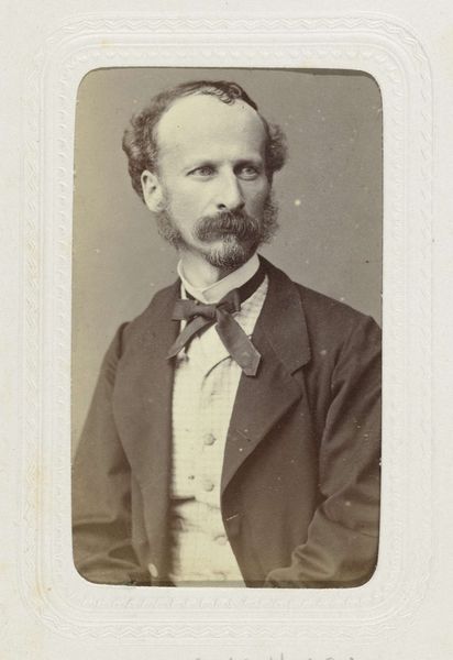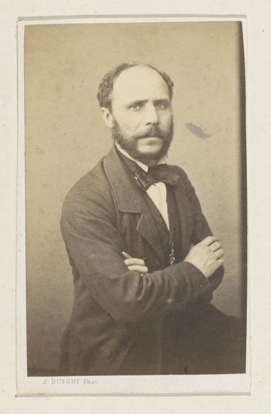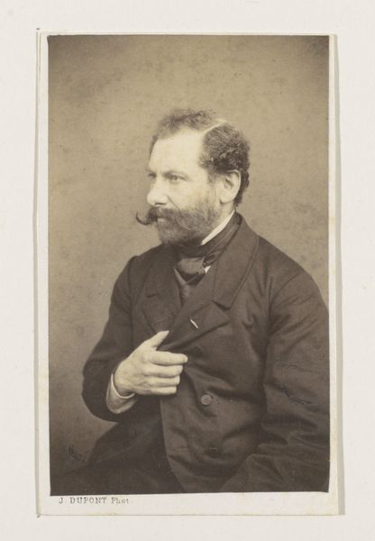Editor: Here we have Joseph Dupont’s 1861 daguerreotype, “Portret van de schilder Gustave Louis Marie Pieron, halffiguur," or "Portrait of the painter Gustave Louis Marie Pieron, Half-Figure.” The subject's gaze is so intense and, well, masculine. What can you tell us about its cultural context? Curator: Dupont's portrait invites us to consider the intersection of art, identity, and emerging technologies in 19th-century Europe. This daguerreotype, while seemingly a straightforward depiction of Pieron, exists within a matrix of social codes and artistic ambitions. The "masculine" gaze, as you termed it, is a performance, isn’t it? How does this staged masculinity reflect broader anxieties and power dynamics of the era? Editor: I hadn't thought about it as performance, but now that you mention it, it really does seem posed, somehow. How might we read the social commentary of something as simple as his pose? Curator: Well, consider that the photographic portrait democratized image-making, previously restricted to the wealthy. Artists like Pieron could cultivate a specific public image. His clothing, his bearing – what story is he telling about himself, and what are the implications for those excluded from that narrative? How does the photographic medium itself reinforce or subvert these power dynamics? Editor: That's a very good point; I see how photography can both democratize and create new forms of exclusion simultaneously. It certainly gives me a new perspective. Curator: Precisely! And this image, beyond its aesthetic qualities, becomes a document, a tool, a potential site of resistance or affirmation, depending on who's holding the lens and whose story gets told. Editor: I’m walking away with a whole new appreciation for the depth and complexity of this portrait. Thanks so much!
