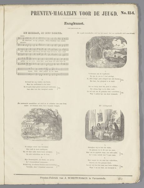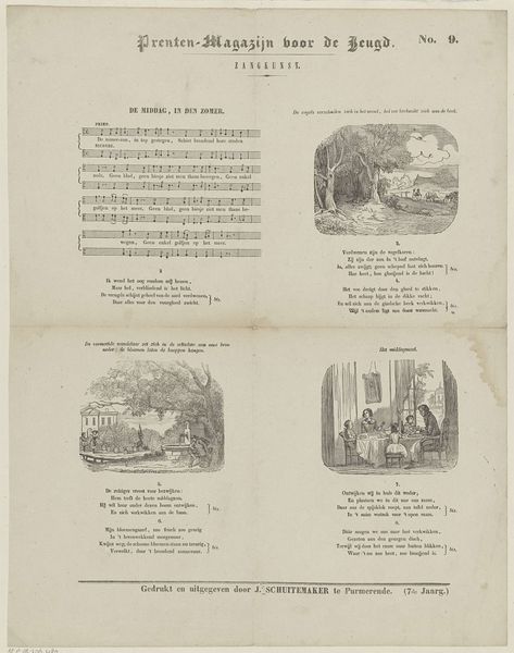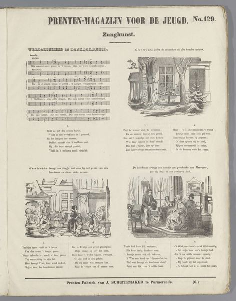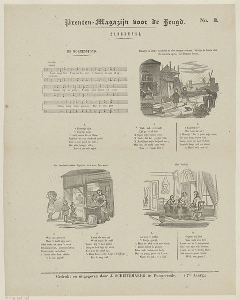 Curator: This print, titled "Weldadigheid en Dankbaarheid," or "Charity and Gratitude" in English, dates from around 1850-1881 and comes from the workshop of D. Noothoven van Goor. It seems to be an engraving, likely for a publication. What's your initial take on it? Editor: A series of little scenes. Almost like vignettes telling a sequential story. It has a very… moralizing mood? Definitely gives off "children's book" vibes, didactic and probably intended to uplift. It's incredibly detailed, look at the engraving on the various scenes! Curator: It does appear to be page from a "Prenten-Magazijn Voor De Jeugd", a Magazine for Youth, with a music snippet along the left margin—further clues to this era’s didactic efforts through material culture. It points toward intended audience & mode of consumption of prints then! I also note Noothoven Van Goor, as a printer, was invested in mass dissemination. Editor: So, it’s designed as both entertainment and moral instruction, targeting families who could afford printed materials for their kids. How interesting, seeing the social commentary in depictions of charity. It is all well organized in sequential panes. But that stark monochrome hits you in a specific way. Curator: Monochrome prints like this are intrinsically tied to industrial print methods during that time—think cost-effectiveness—while, it visually reinforces binary, moral tones: Lightness and dark, virtue and vice, rich and poor. I can almost feel the process—metal plate etching, industrial press runs and even hear conversations on "virtue" across generations within domestic interior space! Editor: Yes! A visual aid almost for Victorian era, very much presentational styles and how you may want children to see "poor people" as part of social reality outside privilege households—there is also sort of "noble-victimness" though that some are presenting that those receiving the charitable donations! How do we negotiate those complexities? Curator: Such illustrations offered carefully managed depictions, and reflect bourgeois societal structure in full spectrum, presenting children with acceptable social frameworks to perpetuate throughout maturity; such framework and dissemination mechanism makes one aware that consumption happens under specific instruction protocols to follow specific societal role from one and onwards. Editor: Reflecting on "Gratitude and Benevolence" it is striking just how resonant and haunting, in their own way are they—though I cannot escape that very rigid-ed instructional feel they convey on its consumers; a chilling glimpse indeed, perhaps the purpose was far wider afterall in its aims on moralistic views!.