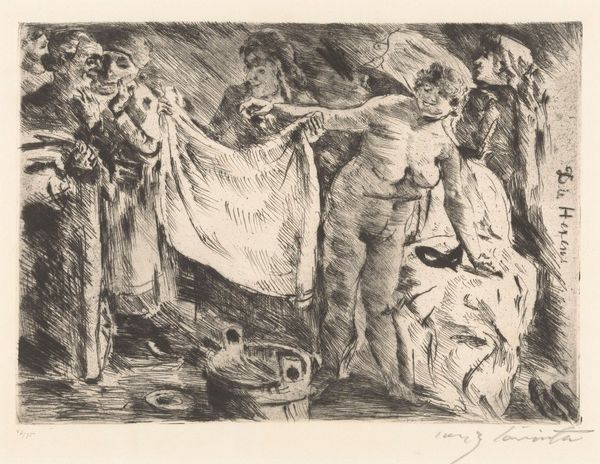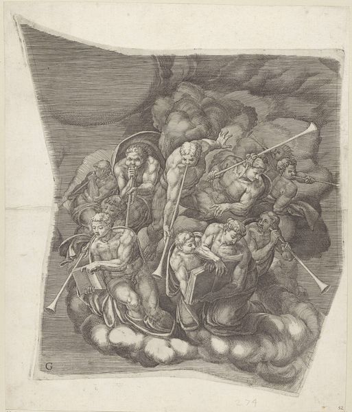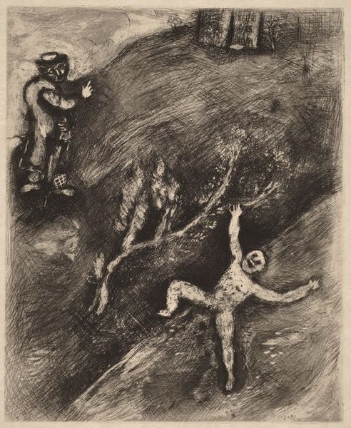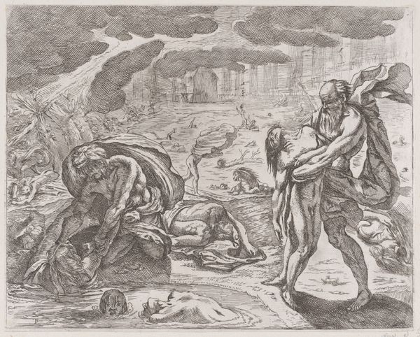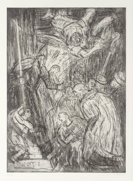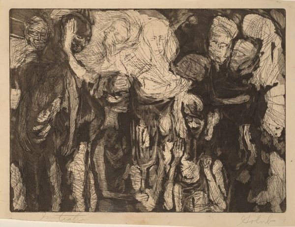 Curator: This print by Morris Topchevsky is titled "In Times of Peace." It seems to capture a moment of collective anguish or protest. Editor: It’s arresting, isn’t it? The stark contrast in the charcoal creates this immediate sense of turmoil and urgency. Look how the artist clusters the figures—it amplifies their distress. Curator: Indeed. The artwork immediately reminds us of the Social Realism movement, with its focus on the struggles and realities of everyday people. Considering the artist's background, it’s likely he aimed to depict socio-political unrest and collective sentiment. The drawing seems to offer insight into the anxieties of his contemporary society. Editor: Observe the formal organization, too. The expressions, the dynamic gestures… Note the rising hands, the tilted heads; all contribute to a sense of imbalance, mirrored in the lack of a clear focal point. Curator: I agree, there is a distinct emphasis on evoking an emotional response from the viewer rather than striving for aesthetic harmony. It really makes you wonder about the role of peace – or the lack thereof – in that era. What are these people responding to? Where are they located? How does power affect each one of their emotions? Editor: Powerfully emotive. The contrast between light and shadow not only gives form, but adds psychological depth, too. I'm drawn to the weeping man obscuring his face with his hands. This raw emotion draws the eyes towards him but not enough to overshadow the other actors in the picture. Curator: We should also consider the visual impact this piece might have had during its time, influencing public perception or sparking social discourse. "In Times of Peace" potentially served as a powerful tool for advocating certain political perspectives. Editor: Yes, its enduring power resides in how the artist translates societal unease into a powerful and emotionally evocative experience. Curator: Thinking about the history, and as a product for change, it invites introspection even today. Editor: Absolutely, seeing this display of technique makes this print impossible to simply pass by.