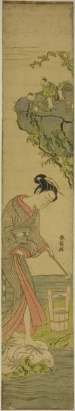 Curator: This print, dating from the late 18th century, is titled "In the Yoshiwara District" and was created by Isoda Koryūsai. Immediately striking, isn't it? Editor: It's… muted. The tones are subdued, almost faded. Makes me wonder about the pigments used, how the colors were achieved back then, the process. And that incredibly tall, slender format, it focuses all attention on the figure. Curator: Absolutely. The print belongs to the Ukiyo-e tradition, which literally translates to "pictures of the floating world.” This period emphasized the impermanence and fleeting pleasures, often depicting courtesans and actors, celebrating their elevated, fashionable lifestyles while highlighting social disparities. The Yoshiwara was the pleasure district, a space both desired and often constrained by gender, class, and obligation. Editor: We're seeing a woman, or perhaps two. One much further back, as if within the building, and the central one walking on the street. Her kimono, and even the bundled cloth, are very textured but quite subtle in tone. The woodblock print making involved a team of artisans—the artist, block carver, and printer. Labor division within craft... all part of the social dynamic this captures, isn’t it? Curator: Precisely! Consider also that, within that system, it was a male dominated world interpreting images of women, especially in this specific district. So much is revealed when we view the artwork and question issues like subject position and the gaze. Her subdued dress, although fine, hints at her place within a defined societal hierarchy and its related cultural narratives. What power did they actually possess when the image, itself a commodity, also captured an unequal representation? Editor: I wonder about the specific wood used for the printing blocks. Did the printer select different blocks for the different fabrics? Did they import woods for sharper, crisper lines, and were they restricted from certain choices? Those details could give a richer understanding of access and the marketplace driving the making of these prints. Curator: Interesting insights on materiality, certainly. Yet it makes us contemplate who these women truly were—individuals within, yet also against the established framework, shaping their stories. Perhaps they could utilize and maneuver within set systems; they did leave some cultural markings of personal creativity and subversion. The way they adorned themselves could carry complex indications. Editor: You're right. This brings to light the hidden aspects that go beyond just admiring a beautiful image. Looking at it now, considering it less from solely a crafted material good viewpoint lets one contemplate beyond a fleeting scene. Curator: Indeed. Analyzing those intersecting realities allows us to reconsider and, maybe, truly honor its diverse figures. Editor: Agreed. Considering this print and all it potentially contains offers much to investigate regarding artistic production and lived realities.