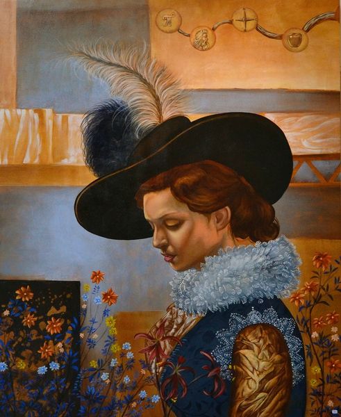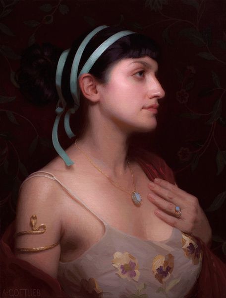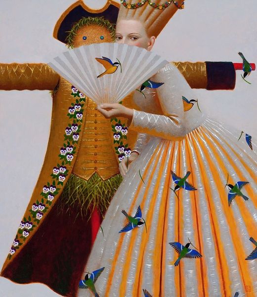Editor: So, here we have Andrey Remnev's "Secret Weapon" from 2019, created with oil paint. It strikes me as incredibly unique; the portrait’s stillness is unnerving, but her dress is so bizarre. What do you make of it? Curator: Looking at Remnev’s choice of oil paints, consider their historical baggage. Oil paints are associated with wealth, the ability to commission portraits; it’s a marker of status. The materiality of the oil, layered painstakingly to achieve this smooth, almost unreal finish, speaks to a meticulous labor. What’s interesting is how he then disrupts that refined tradition. Editor: Disrupts it how? Curator: By adorning her dress with what seem like miniature versions of herself, wings sprouting from their backs! This disrupts the very idea of the singular portrait. We are dealing with representation, of course, but there are multiple figurations of herself embedded onto the material. That gilded yellow garment…it's as though it's almost manufactured, more like a constructed object. What about the single match held in her hand? Does that speak to anything? Editor: Possibly that it is about the start of something - igniting, revealing something. So you see the angel figures more as part of a decorative piece, disrupting the classical portraiture, in order to expose something new in representation, and labour? Curator: Exactly! The labour isn’t just the artist's; it's implicated within the very subject of the painting. How she herself becomes this crafted object, almost a product. Editor: I see your point! Thinking about it in terms of the painting process and the choices made in the materiality definitely deepens my understanding of the 'secret weapon' she embodies. Curator: Yes, by looking at the process of material construction, Remnev's intent becomes clear.