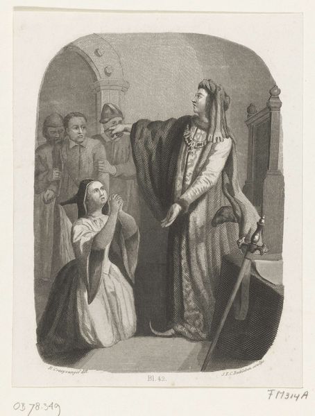 Giovanni Marco Pitteri created this print, "Het sacrament van de eucharistie", using a monochrome palette that emphasizes the solemnity of the scene. Light and shadow play across the figures, structured in a pyramidal composition that directs our gaze to the central act of communion. The artist's delicate lines and tonal gradations articulate the textures of the ecclesiastical robes and the reverent postures of the participants. This attention to form invites us to consider how the ritual is constructed through spatial arrangement and gesture, turning religious ceremony into visual narrative. Pitteri employs a semiotic system where each element—the kneeling figure, the offering of the sacrament, and the architectural backdrop—functions as a signifier of faith and divine encounter. These structured elements allow us to reflect on how symbols and forms in art create a complex visual language.
