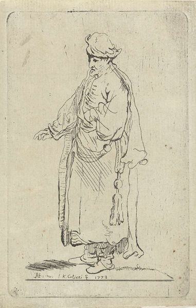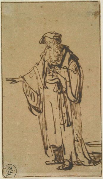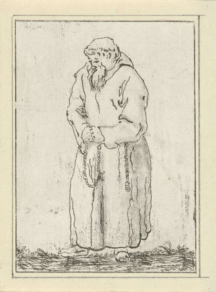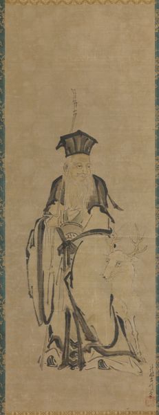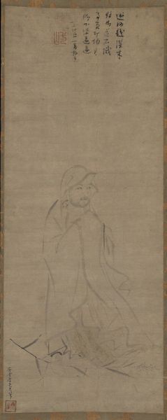 Editor: Here we have "The Buddhist Layman Vimalakirti," an ink drawing on paper scroll by Hakuin Ekaku, dating back to around the 18th century. The expressive brushstrokes and the figure's intense gaze really strike me. How do you interpret this work, beyond just a portrait? Curator: I see a challenge to traditional notions of religious authority and practice. Hakuin, as a Zen Buddhist priest, frequently depicted Vimalakirti, a layman, precisely because Vimalakirti embodies a radical concept: enlightenment is not confined to monastic life or gender roles. He represents the idea that spiritual understanding can be found in everyday existence. How does the text on the scroll influence your perception? Editor: The calligraphy definitely adds another layer. It feels like a commentary, almost like a… caption. Curator: Exactly. The inscription emphasizes Vimalakirti's unconventional teaching. He’s challenging established dogma. Hakuin used this imagery to critique the formalism he saw creeping into Buddhist practice. What do you make of Vimalakirti’s severe gaze? Editor: It's confrontational, almost challenging the viewer. It’s not serene or passive; there’s definitely a sense of intellectual rigor and perhaps even… defiance. Curator: Precisely. This defiance aligns with the broader socio-political context of the time. Think about how challenging it was for individuals outside the traditional power structures to claim spiritual authority. How does understanding this impact your experience of the piece? Editor: It transforms it! I initially saw it as a historical portrait, but now it feels like a call to question authority and to find spirituality in unexpected places. Curator: And it encourages us to look critically at the established narratives that shape our understanding of art, religion, and society itself. Editor: It makes me want to delve deeper into the historical context. This was a very insightful discussion.