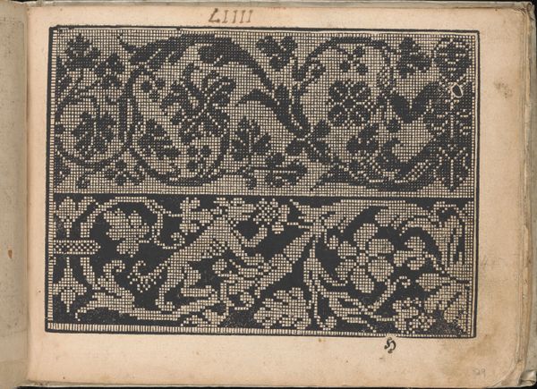 This is a page from "Neu künstlich Modelbuch," or New Artificial Pattern Book, created by Bernhard Jobin in the 16th century. The book’s graphic, high-contrast designs immediately capture our attention. The image is divided into three distinct horizontal bands, each filled with intricate patterns. Notice how Jobin uses a grid as the foundational structure to organize dense arrangements of flora, fauna, and heraldic motifs. The stark contrast between black ink and the off-white paper creates a striking visual texture, almost like a woven tapestry rendered in print. This particular page showcases the era's interest in ornament and the dissemination of design ideas through printmaking. The grid system can be seen as a precursor to modern modular design, where elements are organized within a structured framework. This page isn't just a pattern; it's a window into the early modern world's evolving relationship with visual information and design.