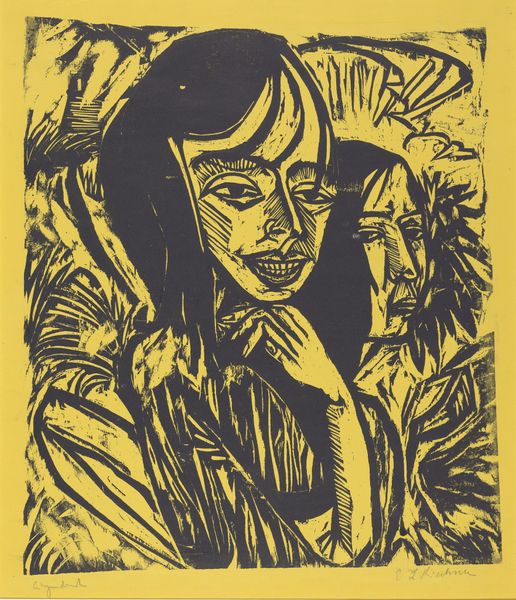 Editor: Ernst Ludwig Kirchner's woodcut, "Girl Dreaming," made in 1918, really strikes me. The stark black and white contrast creates an almost anxious feeling, intensified by the distorted features of the girl's face. How do you interpret this work? Curator: This piece resonates with the anxieties prevalent in post-World War I Germany. Kirchner often employed stark contrasts and distorted figures as you noticed, and in "Girl Dreaming," this becomes a potent symbol. What does the black and white evoke for you, especially considering the historical context? Editor: Well, the lack of color, combined with the harsh lines, almost feels like a visual scream – a reflection of the instability and trauma of the era. It’s a far cry from idealized portrayals of youth. Curator: Exactly. Consider the recurring motifs in Kirchner’s work. Faces become masks reflecting inner turmoil. Do you see echoes of earlier Expressionist portraits here? The elongated features, the unsettling gaze... Editor: I do. It reminds me of Edvard Munch's "The Scream," not just in feeling, but in the way the lines seem to vibrate with tension. It's like the girl's inner state is being projected onto the external world. Curator: Indeed. It's Kirchner’s way of conveying a deeper truth about psychological fragility during that time. The dream isn't necessarily pleasant; it may be filled with unresolved conflicts and fears made palpable. The cultural memory of war finds its way even into sleep. Editor: That’s fascinating. So the title, "Girl Dreaming," is almost ironic, suggesting a potential nightmare rather than a peaceful escape? Curator: Precisely. The symbolism embedded goes beyond mere representation, acting as a cultural mirror, reflecting society's collective unconscious during this critical period. Do you see that resonance now? Editor: Absolutely. It really shifted my perspective to consider the broader cultural implications embedded within the artwork. Curator: Excellent! Analyzing art this way – always considering the layers of context – is essential for understanding not just what an artist created, but why.
