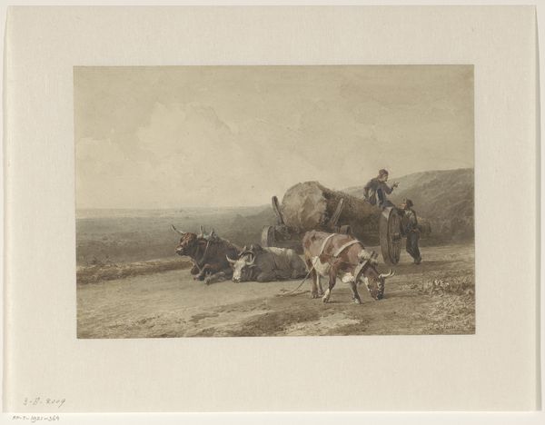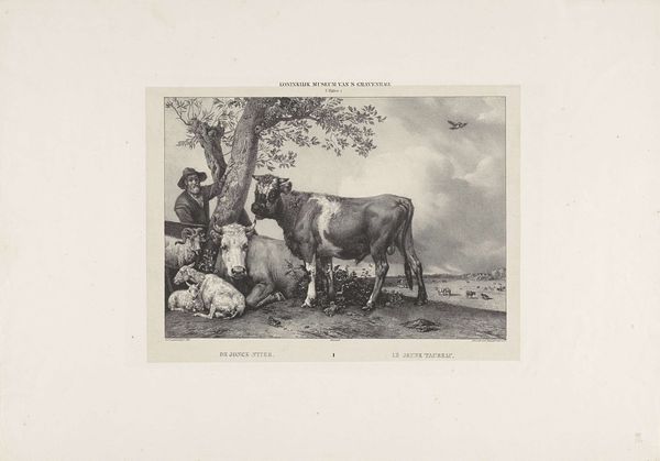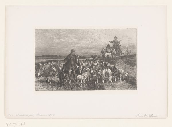 Curator: This lithograph, entitled "Boer en herder met koeien en schapen op weg naar de markt"—which translates to "Farmer and Shepherd with Cows and Sheep on the Way to Market"—was created sometime between 1854 and 1870 by Louis Emmanuel Soulange-Teissier. What are your initial thoughts? Editor: It's striking how muted the tones are. There's a softness to the entire scene, almost like looking at a faded memory. I feel this stillness with this landscape, the animals poised to move but also caught in a quiet moment. Curator: This print embodies realism, capturing a genre painting scene with a seemingly mundane activity. What interests me is how such seemingly 'ordinary' representations were chosen as subjects. This print could speak to the socio-political values invested in the working class at this time. Editor: I agree, but that tranquility feels… almost misleading. If we situate this image within the rise of industrialization and its effect on rural communities, it becomes more complicated. Are we meant to see this journey to market as a celebration of labor or a representation of marginalization? How are we meant to reconcile the figures blurred on the horizon to those centrally depicted with sharp resolution? Curator: Right. The act of depicting laborers does not automatically translate into an elevation of their social standing. Were these idealized depictions? Were these meant for consumption and enjoyment by particular members of the wealthy class, as a testament to their economic power? The seemingly humble subject matter needs further interrogation through the lens of class dynamics. Editor: I'd add gender to the conversation as well. Note who rides horseback—those at the apex of rural patriarchal structure—and whose labour, both animal and human, literally paves the way for them. Curator: Exactly, who holds the power? Whose labor sustains the status quo? These subtle arrangements, these depictions, speak volumes if we position them within larger societal structures of power and inequality. This work reminds us how social structures, in art and life, continue to inform one another, echoing from the past into the present. Editor: And hopefully it will incite reflection for the future too.