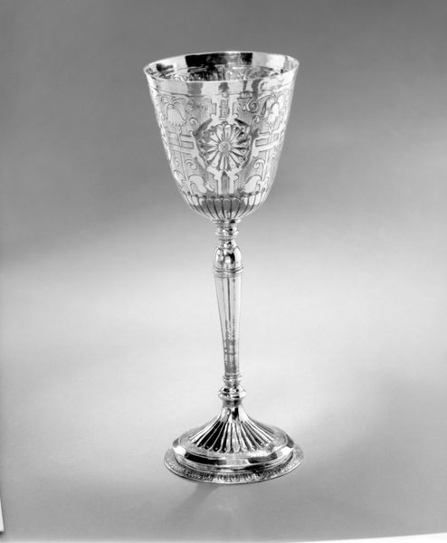 This goblet was made between 1866 and 1891 by Challinor, Taylor and Company, using pressed glass. This wasn't glassblowing, but an industrial process. Molten glass would have been injected into a mold, and then forced into every corner by a machine press. Note the vertical ribs and the lozenge pattern at the base of the bowl, which were easily achieved this way. It may seem paradoxical to think of glass, a hot fluid substance, being treated so rigidly, but this was the logic of Victorian industry. Also consider the agate-like effect of the glass itself. This was meant to give an impression of luxury, without the expense of something like porcelain. It's a fascinating example of how a new manufacturing technique could democratize design, bringing attractive objects to a mass market. This goblet is not exactly high art, but it speaks volumes about industrial ingenuity, consumerism, and class aspirations in the 19th century.