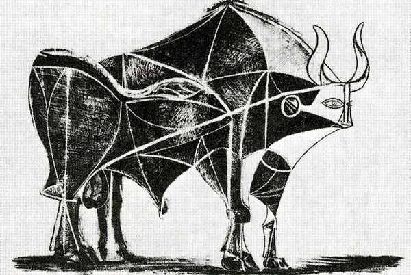 Curator: Oh, wow. I see something imposing. Strong lines and contrasts—what’s this artwork here? Editor: We're looking at Roy Lichtenstein's "Bull I" from 1973, a print now residing at the Museum of Modern Art in New York. Curator: Lichtenstein playing with the image of a bull. Feels loaded, doesn't it? Almost like a challenge to the macho culture that the animal often embodies. It also appears to be geometric—that seems to go against its traditional imagery, in a way. Editor: You hit on something vital. I feel it in my guts too, it's so intriguing to see him simplifying the bull to these stark, almost clinical shapes. Is it strength or something else? It’s got a sense of deconstruction about it, doesn't it? Stripping away the emotion, leaving just the... outline? Curator: Exactly. Consider the historical context. The 70s saw various movements questioning power structures, and Lichtenstein, through his Pop Art lens, engages with this discourse by reducing a symbol of masculine strength to mere form. This begs us to consider: what is left when the veneer of cultural significance is removed? What remains of masculinity itself? Editor: Oh I love that take. It almost looks like an image being run through processing software... it's cool to see. Makes me question ideas of traditional art and the image. By removing colors and shading and emphasizing shape, maybe he is forcing us to think about representation. And also think about the essence of bull-ness... Does the simplification alter our experience with what it means to see that image? Curator: Yes, representation becomes key. It’s not just about the image of the bull, it’s about what that image *does* and who it represents in a broader socio-political landscape. Think about feminism at the time. Consider the evolving narratives surrounding gender and power. How does this minimalist representation intersect with, or perhaps even subvert, those narratives? Editor: Very strong stuff... really compelling questions that you raise. It also kind of feels like seeing only one perspective too. A sort of 2D image—which feels limiting... like there is more, underneath the monochrome depiction. Food for thought, I really love what it stirs up! Curator: Absolutely, these conversations can be very rich and multilayered. I believe there is plenty to digest for us. Editor: Well put, exactly. Plenty to chew on for today I guess.