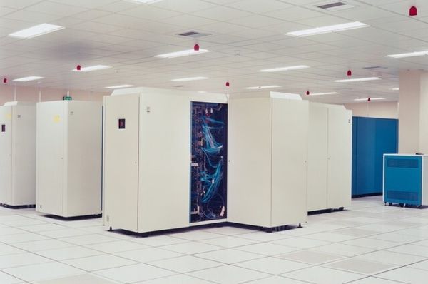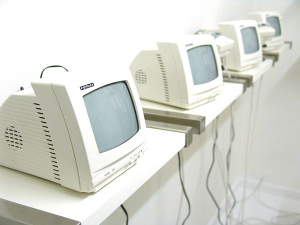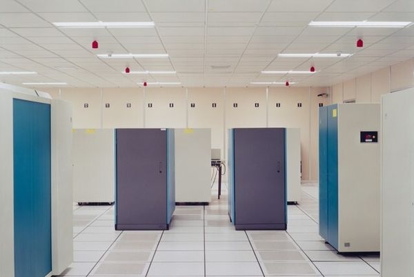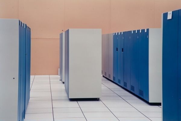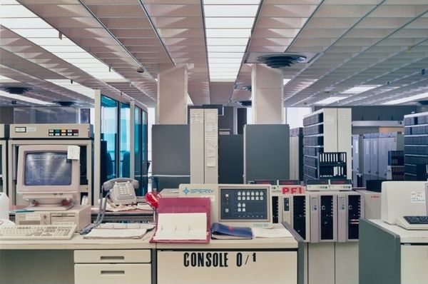 Curator: The photograph before us, “University of Lille, France,” is attributed to Lewis Baltz and likely taken between 1989 and 2006. What's your initial impression? Editor: Immediate reaction? Bleak. It's a symphony of beige and blue, a data center dream… or nightmare, depending on your coding skills. Makes me think of buzzing servers and the quiet desperation of late nights fueled by lukewarm coffee. Curator: It does evoke a certain coldness, doesn't it? Baltz was a key figure in the New Topographics movement. These artists challenged traditional landscape photography by focusing on industrial and suburban environments, often depicting them in a detached, almost clinical way. He's not offering us pretty pictures, but observations. Editor: Observations… yeah, like watching paint dry, but with a vague sense of impending technological doom. I wonder, were those computers state of the art at the time? Now they just seem like relics, monuments to obsolete technology. And what kind of human activity did these computers do? Curator: It's interesting you bring up obsolescence. One reading of Baltz's work, particularly pieces like this, is about the changing landscape of labor and the increasing presence of technology. This image becomes particularly compelling when understood through the lens of how university structures operate, both physically, ideologically, and politically. Consider how quickly computer technology shifted. And as far as our own experience, think how computers as tools affect our human interactions. Editor: That's where the unsettling feeling comes from. It is sterile, dehumanizing, you can’t even tell whether there were human occupants to this data center. I’m struck by the almost obsessive focus on the architecture of these machines; and those wires are dangling haphazardly in comparison to the uniformity of the boxes, making them feel like veins pumping life or energy. Curator: And how interesting to highlight the wires dangling next to boxes, as a point of difference! With their implied movement, you’ve reminded us of life’s capacity to flow around these structures. Editor: Yeah… maybe there's something poetic here too. A whisper of chaos in a world obsessed with order. Curator: I agree completely, which can bring out how well conceptual art photographs provide rich sources to contemplate the relationships between social organizations and how art mirrors this back to society. Editor: Definitely! Seeing this kind of stark image is such a good reminder that sometimes art should disturb, rather than soothe.