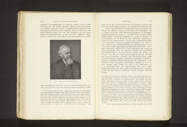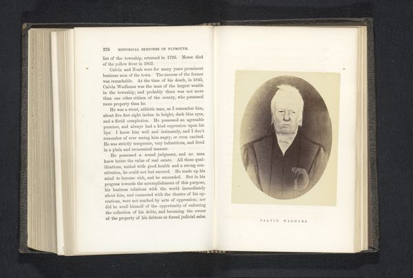 Curator: Look, the book almost seems to cradle the portrait within its pages. What feelings does it spark in you? Editor: An undeniable stillness. A somber yet gentle presence... like a ghost peering out from the past. What can you tell me about this image, or rather where it's been rescued from? Curator: We're looking at a photo reproduction of a portrait identified as "Fotoreproductie van een portret van John Smith" which translates roughly as Photo reproduction of a portrait of John Smith. Created by William H. Schurch sometime before 1873, this photomechanical print appears within a book of historical sketches. The juxtaposition really speaks to how history can be mediated, repackaged and then reframed through changing cultural lenses. Editor: A fascinating detail—a copy of a portrait carefully preserved in print! The texture feels almost ethereal, like a memory slowly fading away. Is there anything else? Curator: Indeed. Consider how images function in preserving legacies. We've got Smith rendered visible across time because his story intertwines with industrialization, evident from the neighboring text, which refers to mining and early trade. And yet, here he's removed from it; abstracted. Editor: It’s as if his image anchors these historical facts, reminding us of the individuals whose labors shaped this history... And yes! a strange form of symbolic afterlife to be caught inside the folds of the narrative like this. Curator: Precisely! A spectral encapsulation. The way this early photograph has been rendered as reproducible media is fascinating from a historical perspective, raising questions about access and power in representation. Whose stories get told and re-told? How is history produced through images and text? Editor: Makes one consider, doesn’t it? If one photograph could embody not only a person but their socio-economic landscape and an unfolding legacy, then this unassuming photo asks more of us. It wants more of a hearing. Curator: Ultimately, this quiet piece incites conversations about history, personhood, and the mechanics of representation that remain critically pertinent. Editor: What an apt reminder that even the smallest of captured likenesses has so much more to communicate when it finally catches the light.
