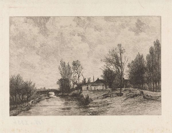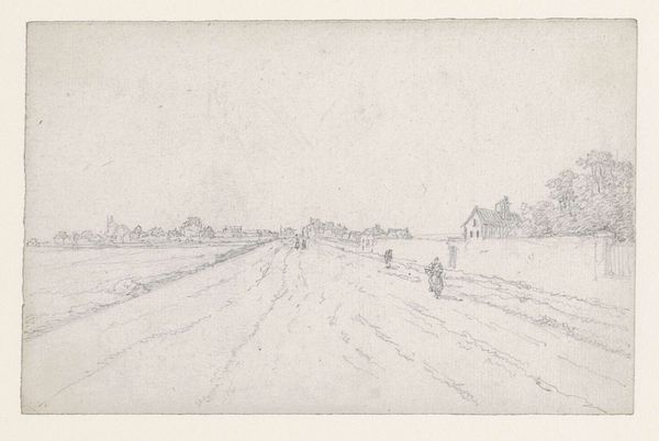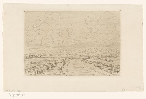 Curator: This etching from 1659, "Landscape with a Road on a Dike", offers us a glimpse into the Dutch Golden Age, through the eyes of Pieter de With, currently held in the collection of the Rijksmuseum. Editor: There's such a quiet intimacy to it. The delicate lines of the etching almost whisper. It feels as though time has slowed, observing something simultaneously serene and somewhat desolate. Curator: Note the title—it’s incredibly descriptive. The dirt composition in the foreground gives the scene a very earthy, raw feel, which speaks volumes about the labor involved in land reclamation. Editor: Absolutely. De With emphasizes a structure with the path or the road. This etching feels remarkably structured, despite the apparent simplicity. The composition guides the eye along that road, from foreground to distant horizon. Curator: Yes, that is also related to his realistic interpretation; you see the dike cutting through, altering the terrain. How does that interplay with the social context do you think? We can see a few indistinct people alongside the road in the distance. Editor: These indistinct figures and their proximity within this desolate landscape become a meditation of life itself. As they work, rest, travel. I get an urge to contemplate what are their struggles? This piece encourages a sense of scale and invites meditation on nature and human condition through simplicity. Curator: The use of etching allowed for multiple impressions. Who had access to this landscape imagery and what did that accessibility mean in the context of a growing merchant class and increasing wealth disparities? We often frame “high art” in different forms of labor but landscape etchings remind us that art making exists beyond painting or sculpting, too. Editor: Agreed. Pieter De With distills nature into these pure, simplified forms; they allow viewers a moment of reflective solace in nature. The quiet of this particular artwork has drawn us each into specific details: to make us explore more deeply how it presents art as both concept and artifact.