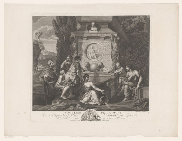 This print, Alexander visiting the tomb of Achilles, was made by Simon Francis Ravenet the elder in the 18th century. It's created using engraving, a printmaking process where lines are incised into a metal plate, which is then inked and pressed onto paper. The image presents a classical scene with a strong sense of drama. Ravenet's skill in engraving is evident in the intricate details and tonal variations he achieves. The material qualities of the print – the fineness of the lines, the contrast between light and shadow, and the texture of the paper – all contribute to its aesthetic impact. Consider the labor involved in creating such a work. Every line is painstakingly cut by hand, a testament to the engraver's skill and patience. The print could be reproduced and distributed widely, contributing to the spread of knowledge and ideas, but the labor is intense and highly skilled, far from the industrialized processes we know today. This print prompts us to consider the relationship between art, labor, and commerce in the 18th century.