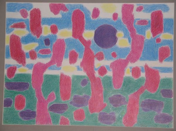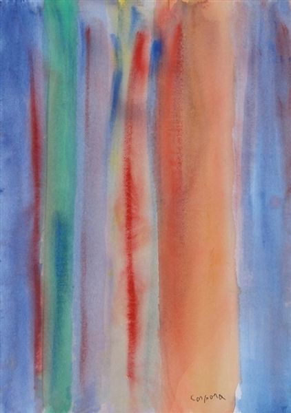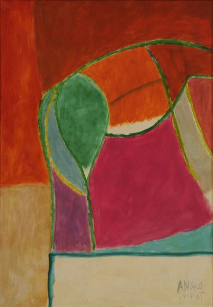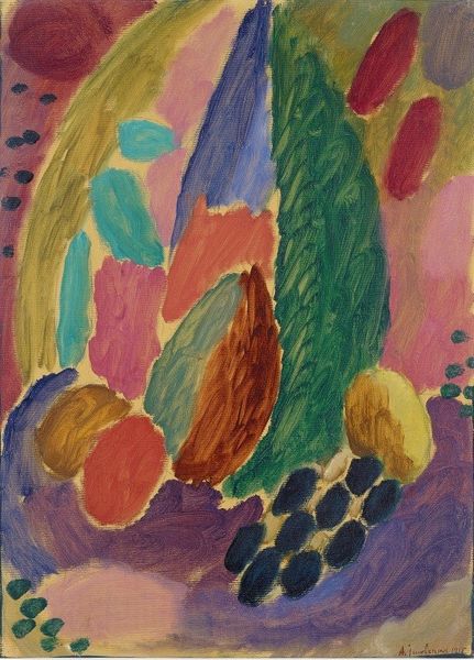 Editor: Jawlensky’s "Autumn Sound," painted in 1918, presents us with a field of soft-edged geometric shapes in watercolor. It’s a very muted palette, and I find it kind of somber, almost melancholic. What stands out to you as you interpret this work? Curator: I’m drawn to how these seemingly simple forms echo deeper, primal symbols. Consider the upright shapes – do they not resonate with figures, totems standing in the rustling silence of autumn? Editor: Totems... that's an interesting way to look at it! I was mainly focusing on the color. Curator: The color contributes, certainly. But Expressionism uses color less as description and more as emotive force. Look at that deep blue, almost a lament, juxtaposed with the faded gold; does it not evoke the transition from life's fullness to its eventual stillness? Consider also how this piece comes on the heels of unimaginable suffering of the first world war. How might you reconsider its interpretation given that knowledge? Editor: Wow, framing it within the war context makes a huge difference. It’s not just seasonal melancholy, it's the loss of life, the world changing. The colors feel like they are mourning something now. Curator: Precisely. These shapes, rendered in watercolor, also recall ancient cave paintings. The choice of material becomes a deliberate link to humanity’s first attempts to capture their world, their feelings, through symbols. What does the concept of the primitive or primordial suggest to you? Editor: Hmmm... A longing for simpler times, maybe? Before the chaos of modernity, which the war obviously shattered. Curator: A return to archetypes, to collective memory. "Autumn Sound," while abstract, is laden with cultural and psychological weight. Editor: I see that now. It’s like Jawlensky found a visual language for universal emotions. So much more than just abstract shapes! Curator: Exactly! Visual imagery offers a kind of symbolic, and sometimes deeply buried, history.