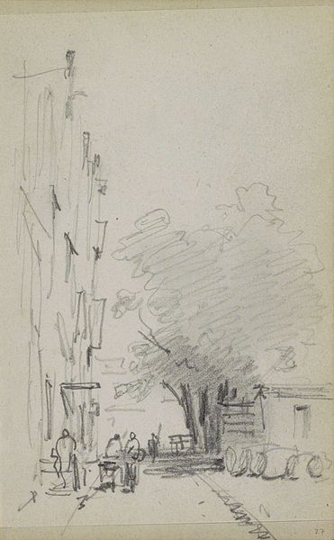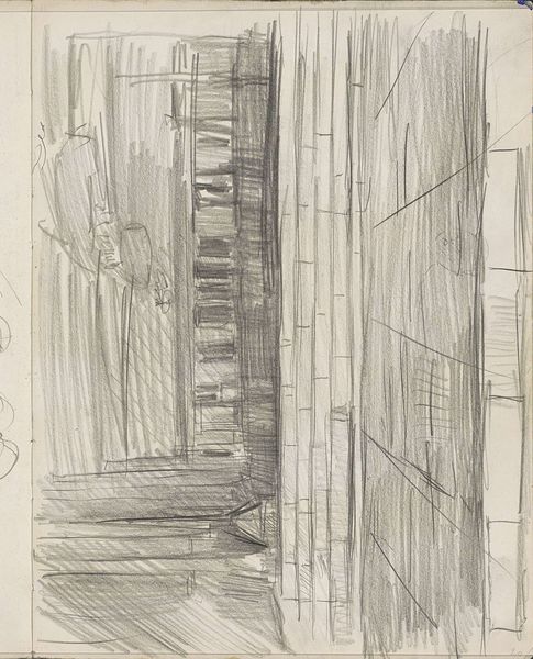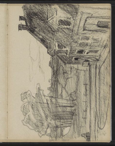 Editor: So, this drawing, "Gebouw" by Isaac Israels, was done sometime between 1875 and 1934 using charcoal. It feels… incomplete, almost ghostly. I’m drawn to how much it suggests with so few lines. What do you see in this piece, particularly in its use of charcoal? Curator: The rapid, almost frenetic application of charcoal is what first strikes me. Israels isn't just depicting a building; he's evoking a feeling, a memory of urban life. Charcoal, with its inherent ephemerality, is a powerful tool for this. Consider how the blurred lines suggest movement, transformation. Does the building itself seem grounded, or is it also caught in this state of flux? Editor: That's interesting; it definitely feels like a fleeting moment. I hadn't considered the impermanence of charcoal relating to the subject in that way. So, what symbolic meanings might you find within a building rendered in this way? Is there anything in the style of rendering that impacts how we see this 'cityscape' theme? Curator: Buildings often represent stability, permanence, the collective memory of a city. But here, the restless charcoal undermines that. Perhaps it reflects the rapid urbanization of the late 19th and early 20th centuries, a time of immense social and architectural change. Look closely: Does it feel like the drawing embodies not just physical movement but also a sense of psychological disorientation, a feeling of being adrift in a rapidly changing world? Editor: It definitely does now that you point it out! I was initially caught up in the aesthetic of the piece. Curator: Exactly. Israels isn't just showing us a building; he is conveying the anxieties and excitements tied up in a changing urban landscape. The charcoal becomes a carrier of that cultural memory, almost like a collective dream. Editor: I see the building as something in transit – it opens my mind to looking for those social implications in what I assumed were simple depictions. Thanks! Curator: It’s been a valuable exploration. Paying close attention to medium and technique can open a broader vista for all of us.