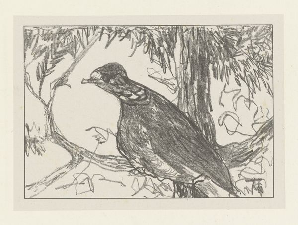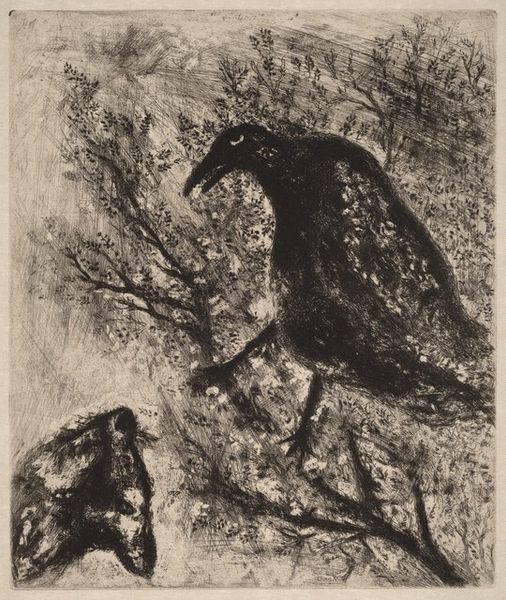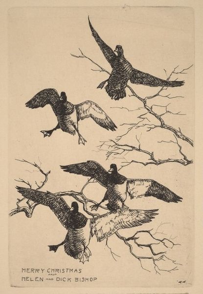 Curator: Here we have Richard Bishop’s “Christmas Card from Helen and Dick Bishop,” a charming etching from 1941. What catches your eye first? Editor: Immediately, it's the bird in flight, emerging dynamically from the stark winter landscape. Its detailed plumage contrasts sharply with the bare trees and subtle shading. Curator: That bird, most likely a partridge or grouse, serves as a complex symbol, especially in the context of 1941. World War II was raging, and Christmas would have carried heightened emotional weight. The bird becomes a potent signifier of resilience. Consider the cultural memory around these birds—game, sustenance, nature—all clinging on amidst societal upheaval. Editor: Right, the figure of the bird signifies both fragility and a determined, powerful agency. We often overlook that duality. Its flight perhaps speaks to a hope for liberation. Etchings, historically, also functioned as a more democratic, mass-produced means of artistic expression. Was there any conscious symbolism here in terms of accessibility? Curator: Possibly. The Bishops could be aligning themselves with a message of hope that reached more people through this accessible medium. It reflects a commitment, maybe even a duty, to community engagement during crisis. Editor: What I also find so striking is the stark simplicity, despite the fine detail within the etching itself. It reflects something deeply ingrained in the Northern European psyche regarding endurance, something stark yet resilient. Curator: Exactly, the very act of choosing this imagery in 1941 challenges any singular narrative around Christmas. It disrupts simple consumerism, emphasizing nature’s power, and offers the family’s personal hopes, and possibly collective solace, in a world descending into darkness. Editor: Seeing the world through their hopeful icon allows us to reimagine a landscape of memory, of connection in even the most austere landscapes. Curator: Precisely, prompting a reevaluation of the values celebrated not only at Christmas, but in society in general.