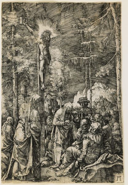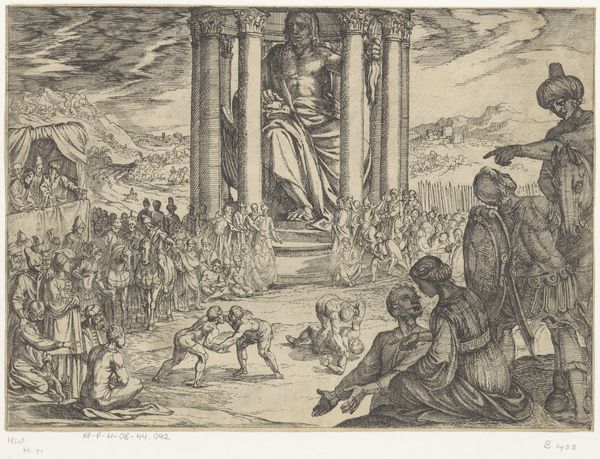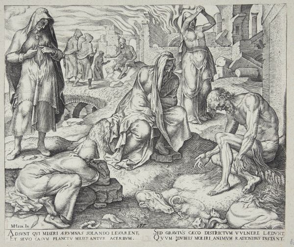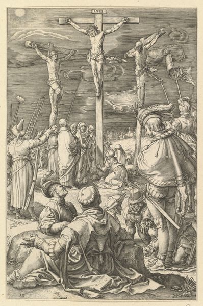 Pieter van der Heyden’s ‘Kruisiging’ engraving presents a scene dominated by stark contrasts of light and shadow, heightening the emotional intensity. The figures are meticulously rendered, their poses and expressions conveying deep sorrow. The composition is structured around the three crosses, which create a strong vertical axis. The arrangement of the figures below forms a semi-circle, drawing the viewer's eye towards the center of the drama. Van der Heyden employs a dense network of lines to model forms and create texture, a technique characteristic of engraving. The architectural backdrop, rendered with precise detail, provides a stark contrast to the raw emotion of the foreground figures. The inscription at the bottom grounds the image in the theological doctrine that Christ was wounded for our transgressions, framing the crucifixion as a moment of sacrifice. The artist utilizes a complex interplay of form and content, inviting us to reflect on themes of suffering, redemption, and the human condition.