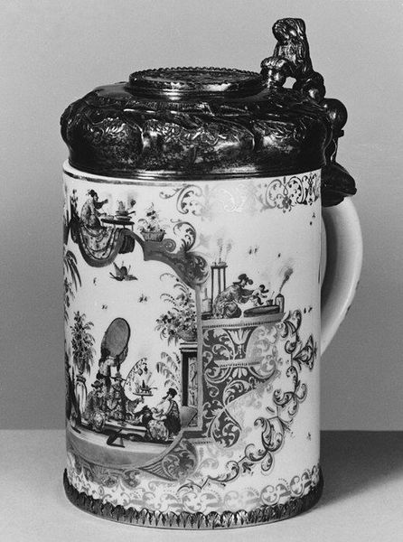 This stoneware tankard was crafted by Eigelstein, a German artist active in the 16th century. At first glance, one notes the interplay of horizontal striations at the top and bottom, contrasting with the intricate figural relief in the middle, all rendered in a muted grey tone. This contrast creates a tension between rigid structure and dynamic storytelling. The body of the tankard is decorated with what appears to be a courtly scene. The figures are framed by dense foliage. The artist’s attention to detail is evident in the textures and patterns, which serve to animate the narrative and invite closer inspection. The interplay of form and function in this piece reflects a broader cultural concern with ornamentation and utility during the Renaissance. The tankard is not just a vessel, but also a canvas for conveying social and cultural messages. It represents the convergence of art, craft, and daily life in the 16th century.