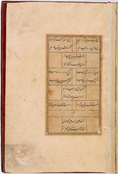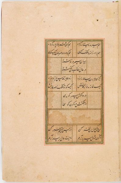 Editor: Here we have Folio 172 from the Divan of Anvari, attributed to Mahesh. It's a rather petite manuscript page. The calligraphy is so intricate; it almost feels like a woven tapestry. How do you interpret this work? Curator: It’s an enchanting piece, isn't it? I see a bridge between the earthly and the divine. The text, likely poetry, is framed by a delicate border, suggesting a glimpse into a world beyond our own. I wonder, what emotions does the calligraphy evoke in you? Editor: I feel a sense of serenity and timelessness. Curator: Yes, a testament to the enduring power of words and art, wouldn’t you agree? It reminds us that beauty can be found even in the smallest of spaces. Editor: Definitely, I appreciate how this piece blends visual art with the written word, creating a harmonious whole.