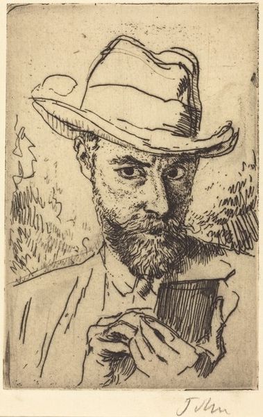Editor: This is Rudolf Grossman’s "Man Seated," created around 1925. It’s an etching, so a print, really. I'm immediately struck by how much the man’s posture communicates weariness, despite being in what looks like a garden. What can you tell me about it? Curator: Absolutely. It's vital to contextualize Grossman's work within the socio-political landscape of the Weimar Republic. Artists during this period often grappled with themes of alienation, disillusionment, and the psychological toll of war and rapid modernization. This man, slumped on the bench, surrounded by a somewhat chaotic rendering of nature, embodies that feeling. Notice the sharp, almost frantic lines of the etching – how do you think that visual tension might reflect the broader societal anxieties of the time? Editor: It’s like the garden is pressing in on him rather than offering any peace. The line work feels agitated, for sure. Curator: Precisely. The medium itself, etching, allows for a certain rawness and immediacy. And I think it also useful to explore questions about the sitter, such as What socio-economic realities might have contributed to his condition? Consider his clothing, his facial expression... how do these visual cues reinforce the sense of fatigue and resignation we’ve observed? Editor: That's a really good point; I hadn’t thought about how much his hat and the worn clothes contribute to this impression. I guess I was focusing on his face and slumped posture. Curator: Exactly. And by exploring those cues in their social context, we reveal how individual experience can be inextricably linked to larger power structures and social realities. It is also interesting to wonder whether the artist empathized with him, or not. What's your take? Editor: Now I'm seeing so many narratives woven into what initially just looked like a simple portrait. I will certainly look at art differently. Curator: That's wonderful to hear. Seeing art this way can empower us to become more critically aware of the world around us.