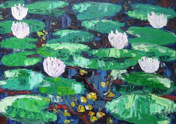 Endre Bartos made this painting, Magic, with oil paint, though the date is unknown. Look at those luscious, fat slabs of paint! It's like Bartos was building something rather than just painting it, piling up dollops of colour to conjure a whole world. The painting is so physical, and it’s hard to ignore the urge to reach out and touch the surface. I bet he used a palette knife. The dark blues of the tree trunks make a strong contrast with the reds, yellows, and greens of the leaves, and it's this tension that brings the scene to life. The lower left corner has a particularly interesting patch of ground; it looks like the colours of the leaves are mirrored by the ground. I'm reminded of Van Gogh and his thick impasto, but Bartos brings a unique, playful energy to the scene. There's no one right way to see this forest – it invites you to get lost in its textures and colours, and find your own magic within it.