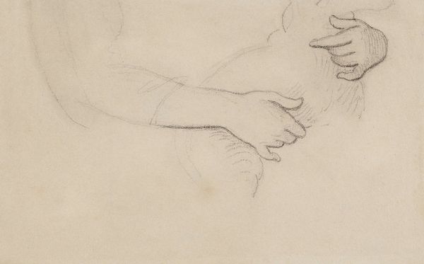Editor: We're looking at "Etude de deux mains," a pencil drawing by Pierre Puvis de Chavannes, created between 1878 and 1882. It depicts two hands, rendered with delicate, yet confident strokes. I’m really struck by the stark contrast against the toned paper, it really makes me wonder about Puvis de Chavannes' intention. How do you approach analysing a drawing like this? Curator: Precisely. Let us consider the inherent qualities of the piece, starting with the formal elements. The stark contrast you mentioned isn't just accidental. Observe how Puvis de Chavannes employs hatching and cross-hatching to model the forms. Where does the artist apply the heaviest concentration of line? Editor: Mostly around the fingers, suggesting the strongest pressure there, creating depth? Curator: Indeed. See how this builds volume, particularly in the foremost hand, drawing our attention. Note also the negative space; how the undefined areas around the hands contribute to the composition. Does this enhance or detract from the central focus? Editor: I think it helps because it really keeps my attention on the hands as the main element. Without that contrast, it might just become background. I am thinking about that balance now in terms of value. Curator: Value is paramount. This deliberate arrangement steers us towards grasping its formal dynamics; the strategic application of light and shadow creates a structured reading, revealing depth and shape. How might this contribute to its reception? Editor: Thinking formally it all seems carefully done with intention…it looks more detailed and completed that it seemed at first. Thanks for showing me that. Curator: My pleasure. Appreciating the language of form allows us deeper insight into artistic practice and thought.