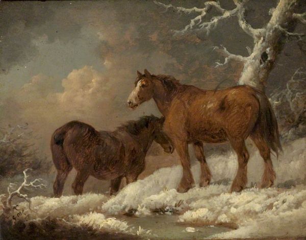 Editor: Here we have George Morland’s "Donkey and Pigs," an oil painting from 1789. It strikes me as quite a humble scene, focusing on these farm animals in what looks like their pen. What do you see in this piece beyond just a pastoral depiction? Curator: I see a potent reflection of the social hierarchy and the romanticized view of rural life prevalent in late 18th-century England. Consider the burgeoning Industrial Revolution at the time. Paintings like this often served to idealize the countryside, almost as a counterpoint to the increasingly harsh realities of urban life for the working class. Do you notice how the animals, though seemingly ordinary, are rendered with a certain dignity? Editor: I do, especially the donkey. It's standing, alert, while the pigs are just… there. Does the donkey perhaps represent something more, a kind of steadfast presence amidst the general inertia? Curator: That’s a very insightful observation! Perhaps Morland is subtly commenting on the role of labor, portraying the donkey as a symbol of steadfastness and perhaps even silent suffering. The pigs, then, could be interpreted as symbols of complacency or even the beneficiaries of a system built on the backs of others. Think about the distribution of wealth and labor during this era – how might this seemingly simple scene speak to those imbalances? Editor: So it's not just a charming farm scene, but potentially a commentary on the socio-economic disparities of the time? I hadn’t considered that! Curator: Exactly! Art often operates on multiple layers. By examining the historical and social context, we can unearth richer meanings within seemingly simple depictions. The choice of these specific animals, their arrangement, and the overall mood all contribute to a broader narrative. Editor: That’s fascinating. I'll definitely look at art differently now, considering its potential as a form of social commentary, even in what appears to be a straightforward landscape. Curator: Precisely, always consider who is represented, who is not, and what power dynamics might be at play.
