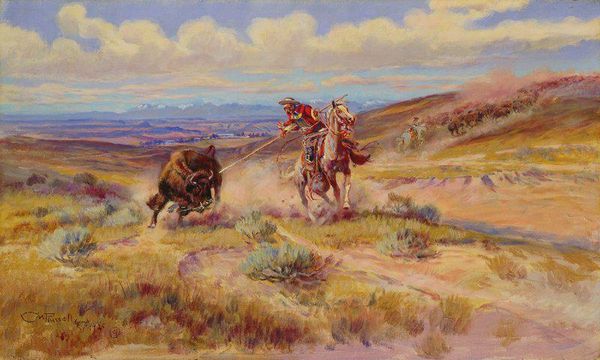 Charles M. Russell made this painting, "Horse of the Hunter," with oil, and it’s like stepping into a sepia-toned dream of the Wild West. Russell’s brushstrokes feel immediate, capturing a sense of urgency that echoes the hunt itself. Looking closely, you can almost feel the dust kicking up from the hooves of the horse and bison; you can see the ochre hues dominate, but if you look closer, there are delicate marks describing the movement of the landscape. Notice the dappled light on the horse, how it creates a rhythm that mirrors the chaos of the hunt. I’m struck by the way he manages to capture a sense of motion with such static materials. Russell’s romantic vision of the West reminds me a bit of Frederic Remington, but there’s a rawness here, an honesty that cuts through the sentimentality. It's like Russell is saying, "This is how it was, or at least how I saw it." Art isn't about fixed meanings anyway, it’s about keeping the conversation going.