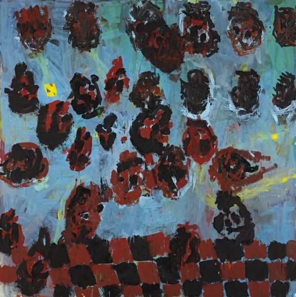 Curator: Jean Dubuffet's "La Fiat aux pare-chocs," created in 1961, exemplifies his exploration of "matter painting," employing mixed-media including acrylic paint. Editor: It’s a dense, chaotic composition. The colors, though vibrant, create a sort of visual overload. What immediately strikes me is how flat it is, almost aggressively so. Curator: Dubuffet was reacting against the conventions of high art. By incorporating industrial imagery and the rawness of everyday materials, he questioned the very nature of what constitutes art. He challenged traditional values through his artistic labor. Editor: Looking closer, there's a crude charm in those awkward, cartoonish car forms outlined in white against that turbulent, earthy ground. Semiotically, it is difficult not to wonder at what the combination of industrial icons and abstract figures might signify? Curator: Consider the social context—the rise of consumer culture, mass production. Dubuffet is taking the detritus of this culture and transforming it through his artistic labor. Notice how the words scrawled onto the canvas resemble graffiti. It shows that even text itself can be considered a material element. Editor: Absolutely. The composition is dense with impasto textures and frantic mark-making, lacking a clear hierarchy, demanding a different way of seeing and de-familiarizing common imagery. The materiality combined with the composition asks a very contemporary question, how much art is truly worth? Curator: By imbuing these discarded symbols of modernity with artistic value, he confronts our consumption patterns. Each daub of paint serves to underline the process of making and consuming as almost simultaneous. Editor: Ultimately, for me, this is an artwork with undeniable presence. Dubuffet's orchestration of form and matter speaks to a fundamental urge to transform ordinary subjects and to express something elemental and visceral. Curator: I see it as an early engagement with recycling practices in the art world. A reminder that our present artistic materials become historical testaments to what we choose to discard, but never quite lose.