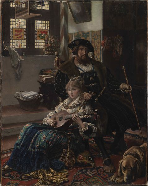 Editor: So, this is John Haynes-Williams' "Ars Longa, Vita Brevis," date unknown, located in the Tate Collections. It's a large painting depicting an artist in his studio. It feels very staged, almost like a tableau vivant. What do you see in this piece beyond the surface? Curator: This painting stages a narrative about artistic labor and legacy, but it also subtly comments on gender and class dynamics within the Victorian art world. The title itself, "Art is long, life is short," is a loaded statement. Consider who has the privilege to pursue "long" art, and whose lives are shortened by social constraints. Editor: That's interesting, I hadn't thought about the social implications of the title. Curator: Look at the figures closely. Who is creating? Who is observing? Who is learning? And what does their positioning suggest about their roles and power within this artistic ecosystem? Are they free from economic and social burdens? Editor: I see, the woman painting seems almost subservient, while the man is the center of attention. I hadn't considered the power dynamics at play here. Curator: Exactly! It is about understanding whose stories are told, and from what perspective. Editor: Thank you, I'll definitely look at paintings differently now. Curator: That’s the idea! Art can be a powerful tool for social commentary.