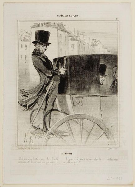 Curator: Honoré Daumier's lithograph, "Le recors," from around the 19th century, jumps out at you immediately with its sharp lines and the rather absurd figure of the groom. What is your impression, initially? Editor: Stark. The contrast of light and dark really punches you. But it’s also oddly delicate in its execution. All those tiny lines to build up the image…it gives it a vibrating, energetic feel, almost like pent-up frustration, visually humming. Curator: Indeed. The frantic lines create such dynamism. I find myself wondering about the social commentary that's packed into such simple execution. Look at the slight figures in the carriage, and then the man standing to the left, outside. Editor: The top hats! Status, right? They loom almost like dark towers. It’s a visual signifier—the hierarchy is impossible to miss. There’s a bit of humor in their inflated height versus the rather pinched expressions, but the darker meaning sits with me too. They appear as almost lifeless as dolls or the horses they ride on. Curator: Daumier excelled at distilling complex social criticisms into a single, impactful image, especially in pieces intended for dissemination through printed periodicals. Note, also, that the entire city landscape beyond the cab melts almost into oblivion, to underscore the elite bubble occupied by the figures in the carriage. It is the background to this main event. Editor: Absolutely. It's that bubble, and those tiny figures contained within, versus the dynamism, almost frantic energy you pointed out, and a dark, smudged kind of presence to this man, it looks like some confrontation. And who or what the recors refers to seems important to decode here. Curator: It might refer to an official tasked with enforcing orders or perhaps seizing goods; given Daumier's politics, it's probably satirical! The social commentary stings even through time. And for a medium supposedly tied to reproducible editions, don't you think it seems wonderfully handmade and utterly singular? Editor: Yes! Almost like it sprung up on the spot from the frustrations of a sharp-eyed witness. What strikes me most now is how relevant those frustrations feel. It makes me want to examine my own “bubble," or the world in which I live now, today. How about you? Curator: Similarly, its persistent power and vitality convince me that Daumier continues to act as our contemporary, making us rethink the way we read each image of supposed daily life.