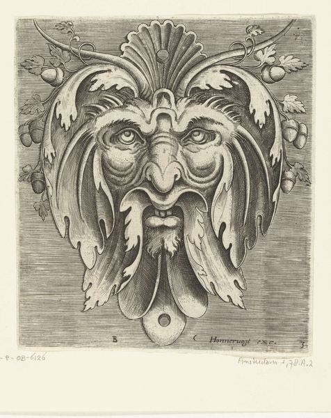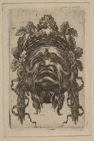 Curator: This etching, titled "Mask," comes to us from the Baroque artist Stefano della Bella, circa 1610 to 1664. He made this print using engraving on, it appears, laid paper. Editor: My first impression is, admittedly, one of unease. There is something about the face that, even in its small scale, feels rather imposing. Its downward gaze almost makes one feel as if they're being judged. Curator: I find it intriguing how della Bella uses line to create a sense of texture. Notice the density of lines that suggest both light and shadow. How he manipulates the cross-hatching in areas like the hair versus the smoother gradations on the face itself. This demonstrates an incredible understanding of form. Editor: But it's precisely that understanding that unsettles me. To what end? Baroque art was frequently tied to power. What is the message? Who benefits? That toothy grin combined with what might be best described as tusks makes me think of power—the way a lord would look down on their subjects. What power structure is it reflecting or even enforcing? Curator: Perhaps, but couldn't we also see it as a comment on the very artificiality of courtly life? Masks conceal. Could this be a meditation on that concealment and the facade it represents, using, indeed, very controlled artistic methods? Editor: Possibly. Although I also see it speaking to an unequal society—this 'mask' and its features are hardly egalitarian, as is reinforced by its status as artwork, a print owned, perhaps, by the aristocracy, or upper merchant class. What about its original viewer? This isn't some innocuous bauble, its symbolic power resonates even centuries later. Curator: You present a valid reading. Perhaps the tension comes from this exact point where artistry and agency converge. Della Bella's skill presents not just a mask, but perhaps poses a reflection on its meaning, intentionally or otherwise. Editor: Maybe, yes. By dissecting those very methods, and contextualizing within the period and its inherent power struggles, can we reveal its significance today. To simply consider line or tone alone falls drastically short, it lacks insight to its function as an object, produced by an unequal, bygone society.