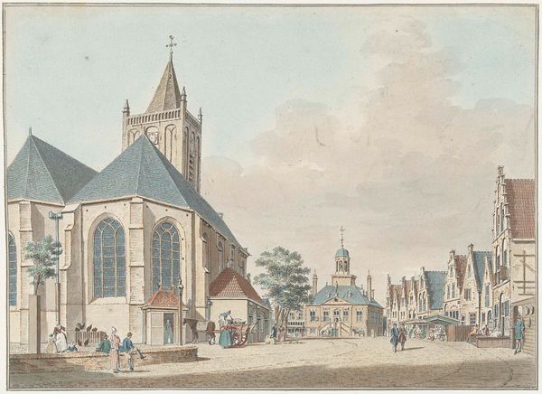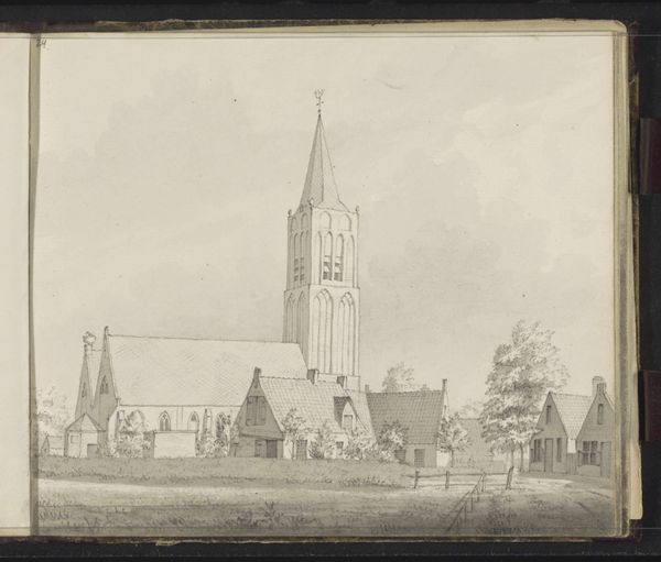 Abraham de Haen the second created ‘The Church of Haringhuizen’ using pen in grey-brown ink and brush in grey, a technique popular at the time for its delicate tonal range. The composition draws our eye upwards, led by the church’s towering spire that dominates the skyline. De Haen uses vertical lines to emphasize the height and imposing nature of the church, a visual symbol of stability and spiritual aspiration. The architectural details are carefully rendered, showing a structured approach to capturing the building's form. However, the use of a muted palette and soft, diluted ink introduces an atmospheric quality. This imbues the drawing with a sense of transience. The surrounding landscape is depicted with looser strokes, contrasting with the precise detailing of the church itself. This juxtaposition invites contemplation of how enduring structures interact with the natural world. The drawing, therefore, becomes not just a representation of a building, but an exploration of the relationship between permanence and change.