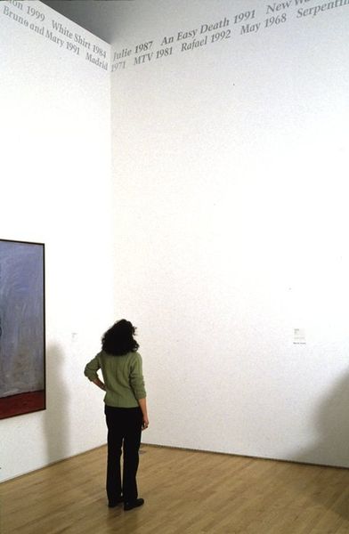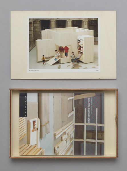 Curator: Ayşe Erkmen created this installation titled *Work, Travel, Life, Style, Sport, Nature* in 1996. It combines photographic imagery with architectural space in a rather unsettling way. Editor: My immediate reaction is unease. The stark white walls, the slightly off-kilter photograph bisected by the doorway… it feels like a stage set for something ominous. The wood flooring seems to be the only element that brings an element of human warmth to this rather strange spatial experience. Curator: I agree. The image itself appears to be an appropriation of a corporate advertisement or stock photograph. It resonates with the aesthetics of consumer culture. Note the almost invasive imposition into what looks like a standard, institutional setting of generic hallways, doors, and walls. Editor: Precisely! The fragmentation is critical. We only see parts of the people in the photograph, forcing a sense of disjuncture. The subjects are involved in what seems like an important meeting; the interruption into our actual space is slightly unnerving, as though their conversation is on pause as long as this architectural division of artwork and institution is apparent to our gaze. The scale is also imposing; how big would you say that the installation’s central element is? Curator: Yes. By strategically placing photographic fragments in unexpected spatial settings, Erkmen creates a visual metaphor about the pervasiveness and influence of images in our contemporary lives, specifically corporate cultural imagery. It speaks to the way we are inundated and formatted through representation to consume and, dare I say, occupy space both mental and actual. Editor: It's clever how the existing architecture functions as a ready-made frame, emphasizing the photographic image's flatness while disrupting its illusionism. I appreciate the play with depth and surface. Erkmen challenges our perception of space and representation by exploiting our established notions of architectural functionality in such environments. Curator: Agreed. Erkmen prompts a meditation on the cultural landscape in our everyday, banal institutional and office places and hallways. I’d agree the artist is challenging us to consider the impact of borrowed or mass cultural information and expectations have on our physical spaces as well. Editor: Thinking of it like that, it also highlights how even “neutral” or supposedly non-descript space is also an arena in which messages play a large role in setting expectations. This photograph of people in an interior could very well be a sign about this specific type of place: one that manages the administration for “Travel” or “Life.” It might signal the corporate expectations in this particular sector or job… Curator: I'm leaving here, reevaluating all borrowed imagery, and rethinking banal public and commercial space as arenas for imposed ideals.