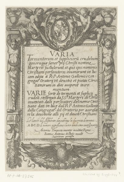Abraham Bosse created this frontispiece for Callot's "The Mysteries of the Passion" using engraving techniques. Immediately, one notices the symmetrical wreath composed of stylized leaves, framing the Latin text. This circular composition gives the work a sense of classical harmony and balance, typical of its era. The text, centered within the wreath, is a key structural element, dividing the pictorial space, where the inscriptions "IHS" and "MA", symbols of Jesus and Mary, are placed on alternating sides, creating a semiotic rhythm. Bosse uses line weight and density to articulate depth and texture, particularly in the leaves. These are not merely decorative; they contribute to a visual language that evokes themes of devotion and reflection. The arrangement isn't just aesthetic; it's a structured presentation of religious content, characteristic of the period's engagement with faith through visual and textual means. The print thus functions as a formal gateway, inviting viewers into a contemplative experience of the Passion.