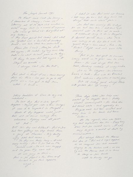 Curator: Here we have Hryhorii Havrylenko's "Composition (Tribute to Pushkin)," made in 1974 using paper, ink, and watercolor. Editor: It's quite understated, almost melancholic with its pale blue background. The handwritten poem encircled by a halo feels like a ghostly echo. What does this piece tell us about its time and place, especially concerning its materials and the labor involved? Curator: Let’s consider the context of Soviet Nonconformist Art. Official art demanded socialist realism. But here, the artist is working with simple materials, accessible to most, circumventing the official channels that controlled access to expensive art supplies like oils and canvases. Editor: So the very act of using paper, ink, and watercolor becomes a quiet act of resistance? Curator: Precisely. Think about the labor, too. Instead of mass-produced imagery, we have the intimacy of the hand. Each letter painstakingly written, a direct connection to Pushkin, yet subtly defiant. Even the “mistakes” in handwriting and imperfections inherent to the media suggest unmediated expression. Does that make sense? Editor: Absolutely. It subverts the expectation of flawless reproduction prevalent in propaganda. It's a material statement, about the value of individual expression, using what’s available. It challenges our conventional notions of high art. Curator: What does the tribute to Pushkin mean here? Is he merely commemorating the poet, or perhaps appropriating his works and recontextualizing him in a world, that shares some parallels but also presents contradictions, for him? Editor: Interesting, seeing art not as divine inspiration, but tangible matter born of work. Thanks for bringing materiality into focus! Curator: Likewise, recognizing the constraints and subversions within material choices reveals layers of meaning within seemingly simple art.