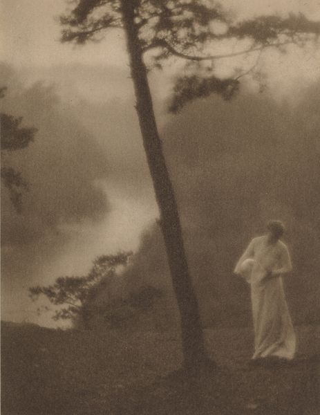 Curator: Good afternoon, and welcome. We're standing before "Portrait of Alvin Langdon Coburn," a photogravure created sometime in the early 20th century by George Bernard Shaw, now residing here at the Minneapolis Institute of Art. Editor: Mmm, sepia dreams. I feel a tender melancholia radiating from it, a longing glance into some untold, Edwardian past. Curator: Precisely. The image, executed with the gelatin-silver print method, embraces the Pictorialist aesthetic. Observe how the sharp details dissolve into softer, atmospheric hazes, intentionally blurring the lines between photography and painting. Editor: There’s such intimacy in the subject’s posture too. Curled up, pondering life, nestled under the blurry fronds of some tree, oblivious to the eye of the camera... or pretending to be. Curator: It speaks to Shaw's sophisticated control of light and shadow, where visual weight emphasizes Coburn's intellectual character through his pensive attitude and slightly downcast eyes. The delicate balance between formal portraiture and spontaneous snapshot lends it an unusually modern appeal. Editor: What’s interesting is how much this makes Coburn into an anonymous figure. I can't quite make out his expression. Instead, it’s this very specific mood, almost like a personal, sepia-toned poem that's highlighted. Curator: Indeed. And we must consider the socio-historical context. This image was created during an era captivated by celebrity portraits. Yet, Shaw’s piece goes further—it delves into the psyche. This isn't simply about documenting Coburn; it’s about evoking a mood and an intellectual spirit, filtered through Shaw's subjective vision. Editor: It also makes me think about our relationship with images. Today, we snap hundreds, but they don't necessarily make for good portraits. Perhaps the slowness of that technique created the space for this contemplative feeling. Curator: A worthwhile insight. The patience undoubtedly lends an almost dreamlike quality. It’s quite compelling. Editor: For me, I find beauty in its ephemeral quality and blurred realism. This one hits a note. Curator: And I am always reminded by such enduring artworks, how their meticulous structure enables precisely these intuitive encounters.