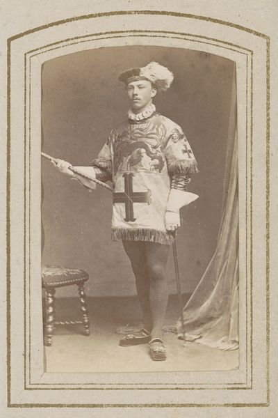 Editor: This is "Portrait of a Javanese Prince," a photograph taken sometime between 1860 and 1870 by Woodbury & Page, currently held at the Rijksmuseum. The detail in the prince's clothing is striking, but what immediately grabs my attention is how the photographer uses light and shadow. What do you see in this piece from a more formal perspective? Curator: Focusing solely on the formal elements, one is immediately struck by the strategic use of the sepia tone, lending an air of antiquity and seriousness to the subject. Observe the arrangement of forms; the central figure dominates, effectively creating a focal point through a symmetrical, albeit not perfect, composition. How would you interpret the interplay between texture and pattern here? Editor: Well, the smooth background emphasizes the intricate patterns on the prince's sarong and jacket. There's a real contrast between the crisp details on his upper body and the somewhat blurred details towards the bottom. Curator: Precisely. The contrasting textures guide the viewer's eye. Furthermore, consider the balance created by the diagonal lines, originating from the sword held in the prince's hand. This opposes the line established by the staff, grounding the visual dynamism within a stable, pyramidal composition. Notice that one bare foot disrupts expectations by not presenting a perfectly symmetrical composition. It challenges our reading, doesn’t it? Editor: It does! The single bare foot invites you to consider the composition as more staged than purely representative. I hadn't thought about the directional lines that way either. It’s all cleverly constructed, even in a photograph. Curator: Yes, by studying the visual elements--light, shadow, texture, form, and composition--one discovers a complexity within the photograph, a deliberate construction intended to convey power and prestige through visual language alone. Editor: I’ll definitely be paying closer attention to formal composition in photography going forward! Thanks for the lesson!